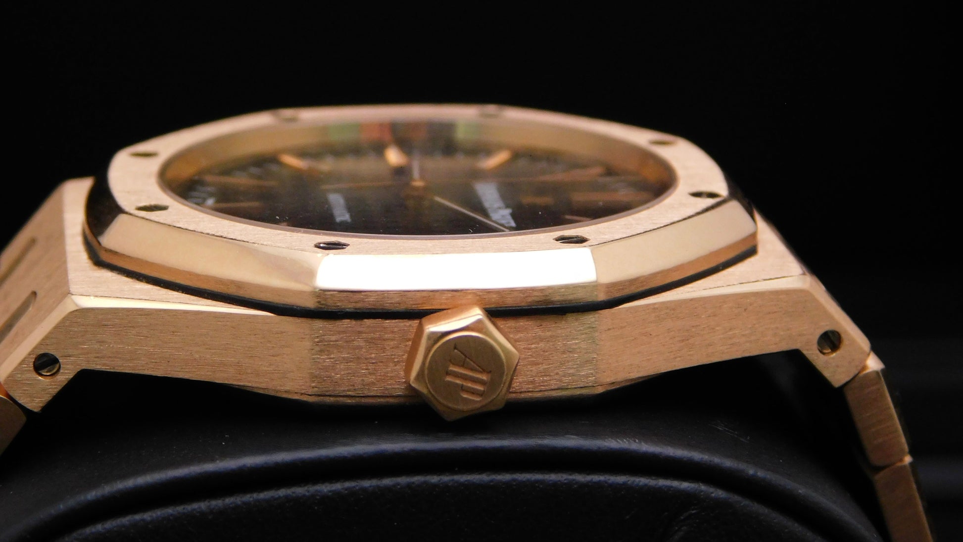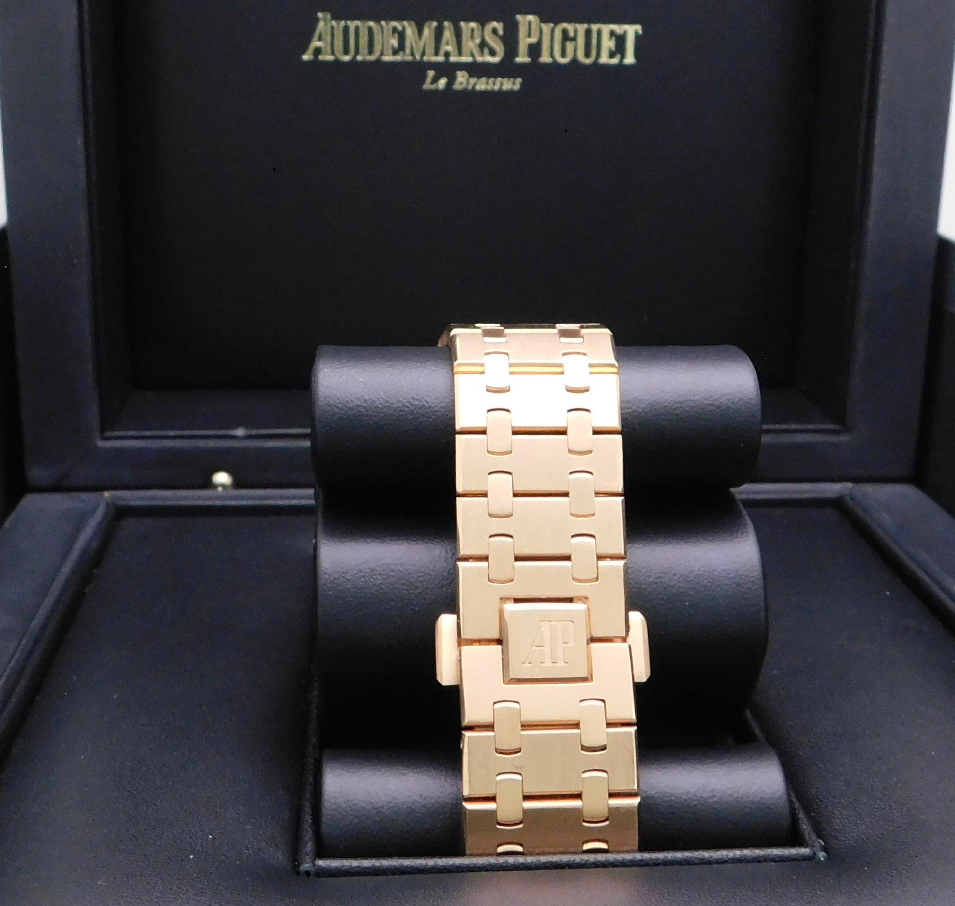 - Brand: Audemars Piguet Model: Royal OakReference Number:(15500OR.OO.1220OR.01)Gender: MensMetal: 18K Rose GoldCase Size: 41.00mmWrist Size: Please contact us prior to purchasing this item if the removal of links is necessary.Movement: Original Audemars Piguet Swiss Automatic Movement.Crystal: Original Audemars Piguet Scratch-Resistant Sapphire.Dial: Original Audemars Piguet Black Index Dial with the date at 3 o’clock.Band: Original Audemars Piguet 18K Rose Gold Band.Box: YESPapers: No