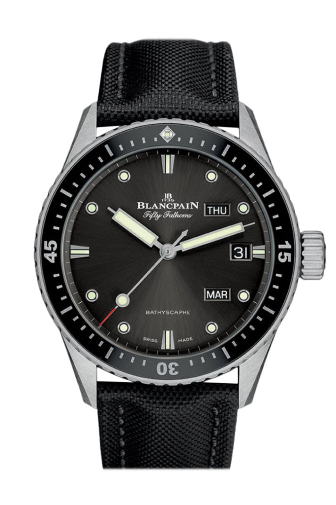 Silver-tone stainless steel case with a black sail canvas strap. Uni-directional rotating black ceramic bezel. Grey meteor dial with silver-tone hands and index hour markers. Minute markers around the outer rim. Dial Type: Analog. Luminescent hands and markers. Month. day and date display at the 2. 3, and 4 o'clock position. Blancpain Calibre 6054.P automatic movement with a 72-hour power reserve. Scratch resistant sapphire crystal. Screw down crown. Transparent case back. Round case shape, case size: 43 mm, case thickness: 13.10 mm. Band width: 23 mm. Tang clasp. Water resistant at 300 meters / 1000 feet. Functions: hour, minute, second, annual calander. Luxury watch style. Watch label: Swiss Made. Blancpain Fifty Fathoms Bathyscaphe Annual Calender Automatic Meteor Grey Dial Mens Watch