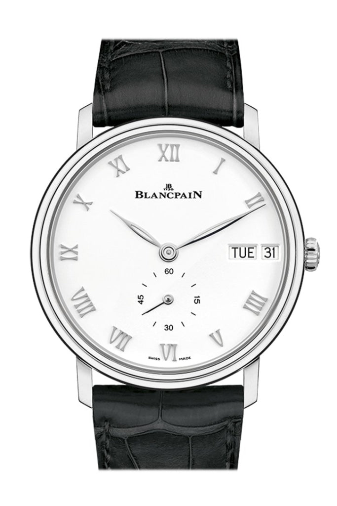 Silver-tone stainless steel case with a black leather strap. Fixed silver-tone stainless steel bezel. White dial with silver-tone hands and Roman numeral hour markers. Dial Type: Analog. Day of the week and date display at the 3 o'clock position. One - small second subdial. Blancpain Calibre 1160DD automatic movement with a 72-hour power reserve. Scratch resistant sapphire crystal. Pull / push crown. Transparent case back. Round case shape, case size: 40 mm, case thickness: 10.4 mm. Deployment clasp. Water resistant at 30 meters / 100 feet. Functions: date, day, hour, minute, small second. Luxury watch style. Watch label: Swiss Made. Blancpain Villeret Ultra Slim Automatic White Dial Mens Watch 6652-1127-55B