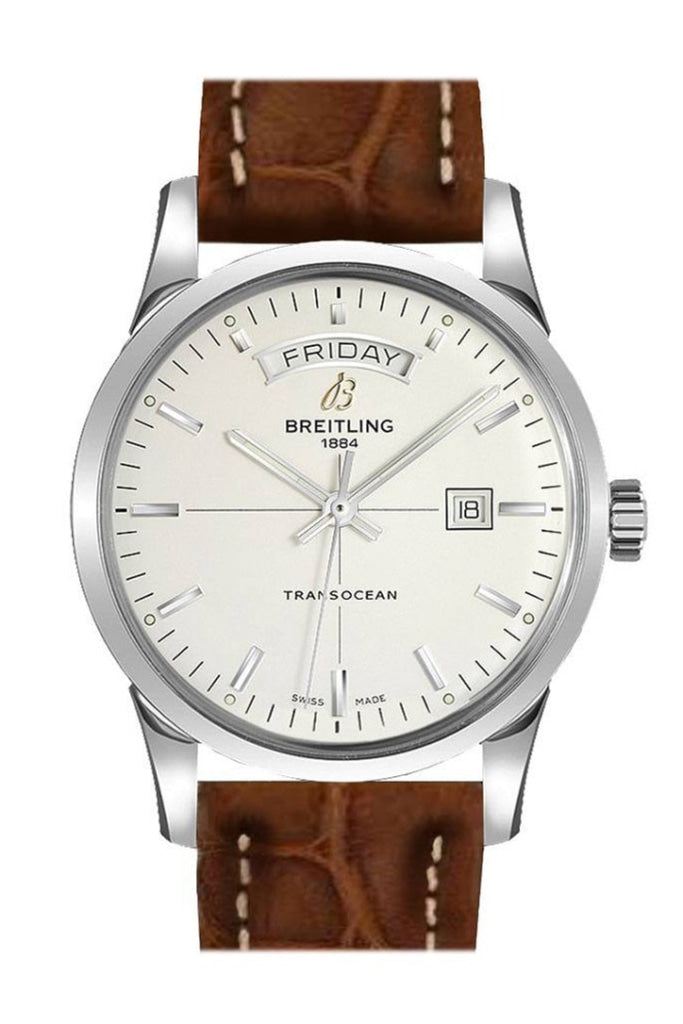 Breitling Brown Leather Tang Mercury Silver Transocean Day Date Brown Leather A4531012