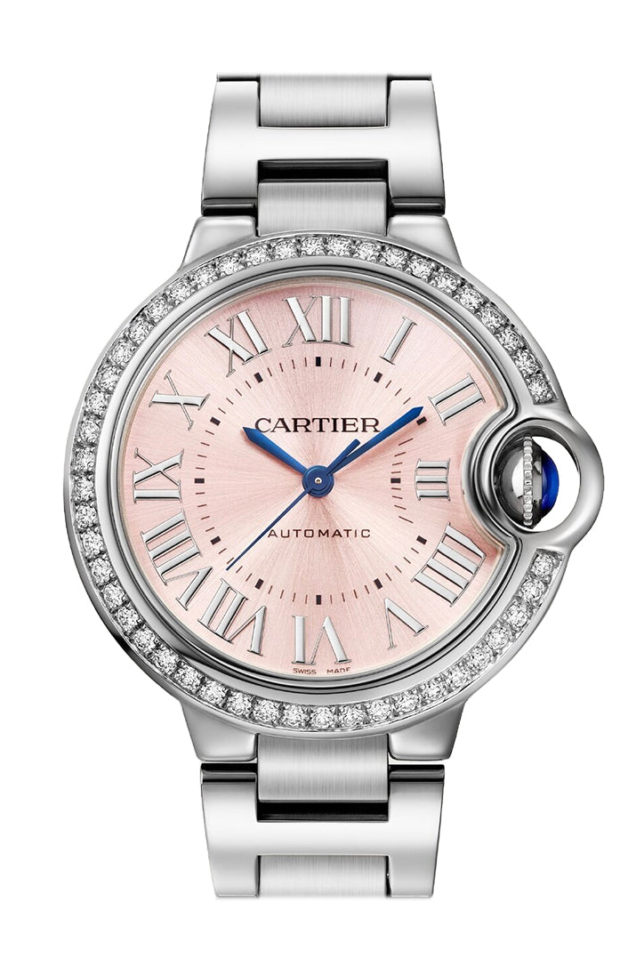 The Cartier Ballon Bleu de Cartier W4BB0037 is a 33 mm steel watch featuring a diamond-set bezel with 50 diamonds, a pink sunray dial Watch