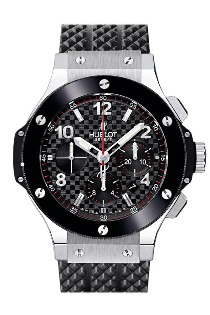 Stainless steel case with a black rubber strap. Fixed black ceramic bezel. Black carbon fiber pattern dial with luminous hands and alternating Arabic numeral and index hour markers. Minute markers around the outer rim. Dial Type: Analog. Luminescent hands and markers. Date display appears between the 4 and 5 o'clock positions. Chronograph - three sub-dials displaying: 60 second, 30 minute and 12 hour. Automatic movement with a 42-hour power reserve. Scratch resistant sapphire crystal. Pull / push crown. Transparent case back. Case diameter: 44 mm. Case thickness: 14.5 mm. Round case shape. Band width: 25 mm. Band length: 8 inches. Fold over clasp with a push button release. Water resistant at 100 meters / 330 feet. Functions: hours, minutes, seconds, calendar, chronograph. Sport watch style. Watch label: Swiss Made. Item Variations: 301.SB.131.RX, 301-SB-131-RX, 301/SB/131/RX, 301SB131RX. Hublot Big Bang Steel Ceramic Mens Watch