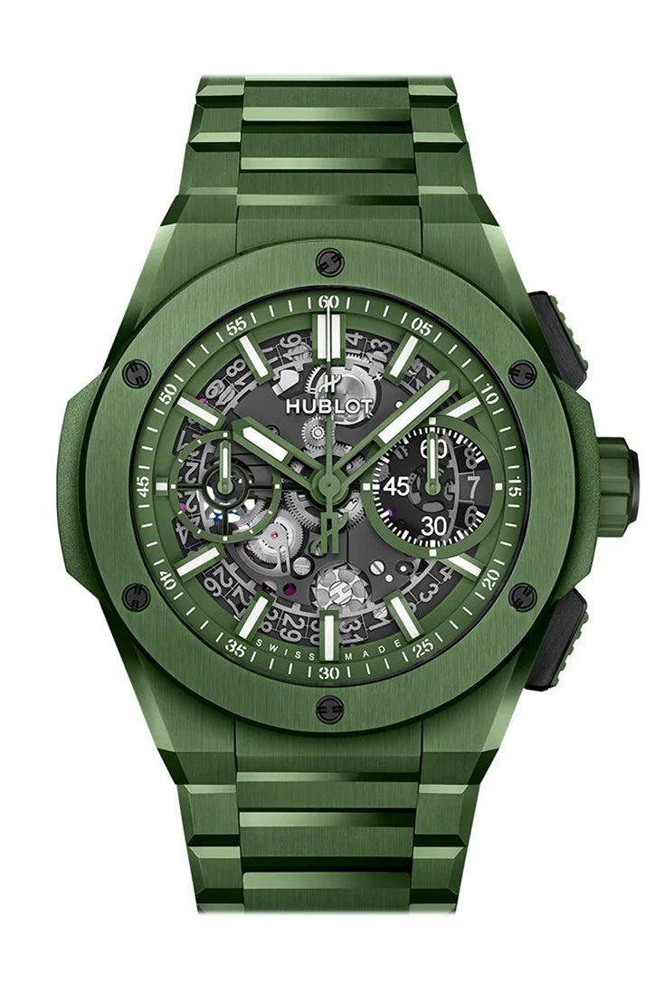 The Hublot Big Bang Integral Skeletonized Dial Green Ceramic 451.GX.5220.GX is a striking timepiece that combines modern design with exceptional craftsmanship. Featuring a green ceramic case and a skeletonized dial, it showcases Hublot's signature fusion of materials. The integrated bracelet adds to its sleek, cohesive look, while the open dial reveals the intricate movement within. This watch offers both a bold aesthetic and high-performance mechanics, perfect for luxury watch enthusiasts.