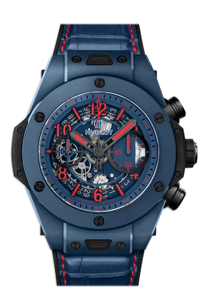 Hublot Big Bang UNICO 45mm Watch 411.EX.5113.LR.SPO18 Limited Edition Shape Round Case 45mm Case Dimensions Material Ceramic Case Skeleton Dial Color Scratch Resistant Sapphire Crystal Fixed Bezel Screw-in Crown 100m/330ft Water Resistance Back Transparent Case Alligator/Crocodile Leather Band Material Blue Color/Finish Additional black rubber strap Push Button Deployant Buckle Clasp Automatic Movement Chronograph Complications