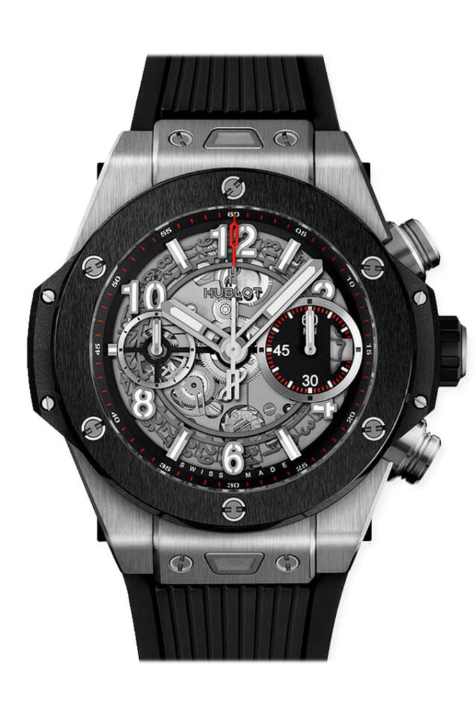 Satin-finished and polished titanium case with a black structured lined rubber strap. Satin-finished and polished black ceramic bezel. Mat black skeleton dial with silver-tone hands and Arabic numeral hour markers. Minute scale around the inner rim. Dial Type: Analog. Date display at the 3 o'clock position. Chronograph - sub-dials displaying: two - 60 second and 60 minute. Hublot Calibre HUB1280 automatic movement with a 72-hour power reserve. Scratch resistant sapphire crystal. Round case shape. Case size: 42 mm. Water resistant at 100 meters / 330 feet. Functions: chronograph, date, hour, minute, second. Luxury watch style. Watch label: Swiss Made. Hublot Big Bang UNICO Chronograph Automatic Men's Watch 441.NM.1170.RX