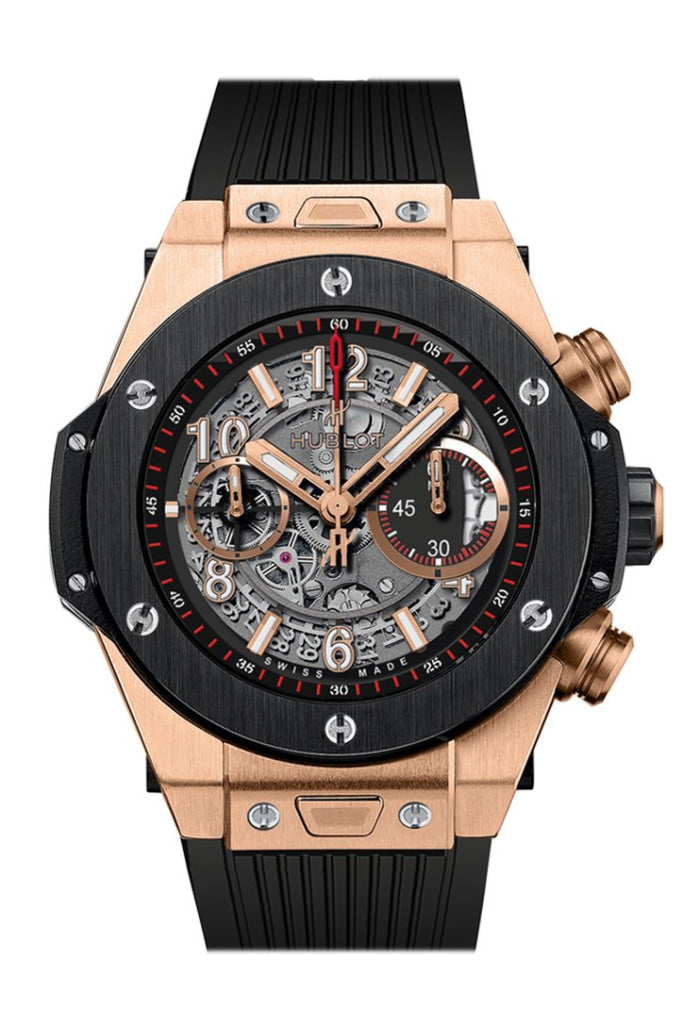 18kt king gold case with a black rubber strap. Fixed black ceramic bezel. Skeleton dial with rose gold-tone hands and alternating index and Arabic numeral hour markers. Minute markers around the outer rim. Dial Type: Analog. Luminescent hands and markers. Chronograph - two sub-dials displaying: 60 second and 60 minute. Automatic movement with a 72 hour power reserve. Scratch resistant anti-reflective sapphire crystal. Transparent sapphire case back. Case diameter: 45 mm. Round case shape. Deployment clasp. Water resistant at 100 meters / 330 feet. Functions: chronograph, hour, minute, second, flyback. Luxury watch style. Watch label: Swiss Made. Hublot Big Bang Unico King Gold Ceramic Skeletal Dial Mens Watch 411.OM.1180.RX