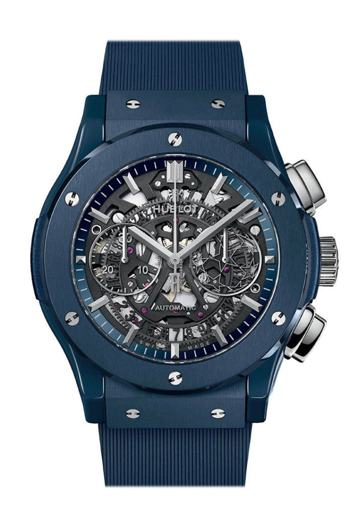 The Hublot Classic Fusion AeroFusion chronograph UEFA Champions League fake has a smoky midnight blue polished and satin-finished ceramic 45mm case and bezel. Its crown, chronograph pushers and trademark bezel screws are in contrasting polished titanium. The graphic look is created by the architectural form of the HUB1155 skeleton movement’s blackened bridges, which also serve as a platform for a transparent sapphire dial. That dial is decorated with applied hour markers and twin counters for the chronograph minutes and running seconds, which appear to float over the movement below. The sapphire under the running seconds counter at 3 o’clock is decorated with the repeating star motif from the UEFA Champions League logo.