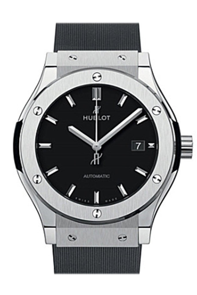 Titanium case with a black alligator/rubber strap. Fixed titanium bezel. Black dial with silver-toned hands and index hour markers. Dial Type: Analog. Date display at the 3 o'clock position. Automatic movement. Scratch resistant sapphire crystal. Transparent case back. Case diameter: 42 mm. Round case shape. Deployment clasp. Water resistant at 50 meters / 165 feet. Functions: date, hour, minute, second. Luxury watch style. Watch label: Swiss Made. Hublot Classic Fusion Black Dial Titanium Automatic Mens Watch