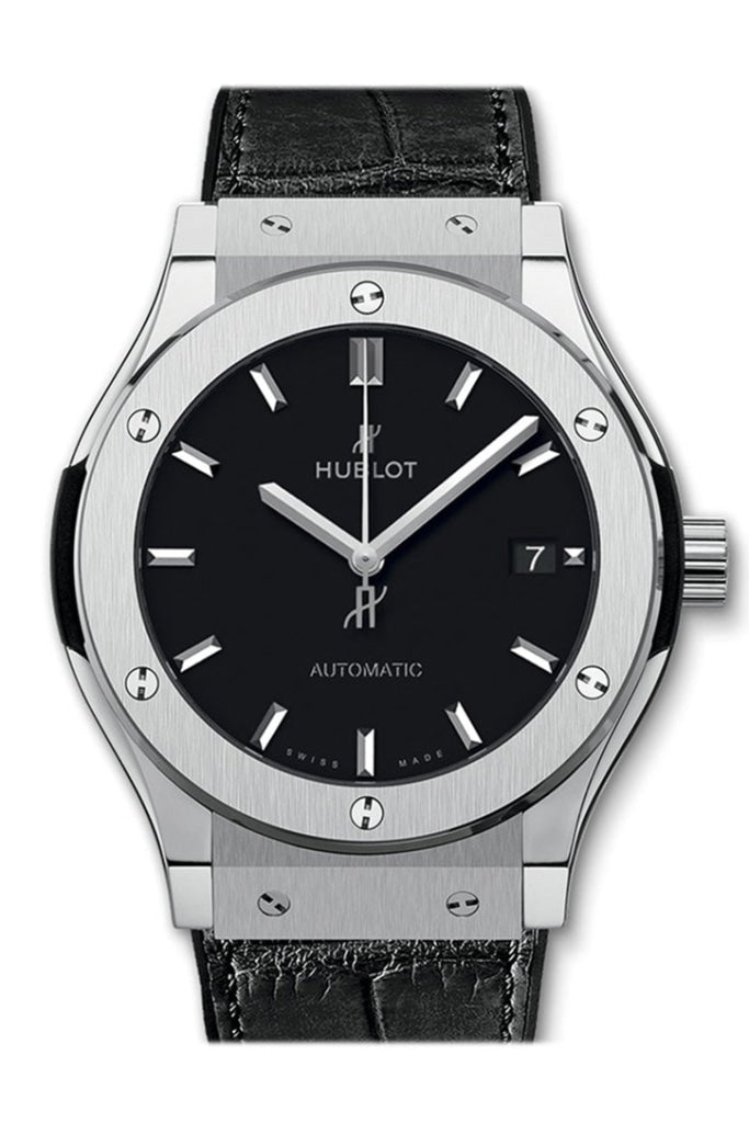 Hublot Classic Fusion Automatic Black Dial Titanium Men's Watch 542.NX.1171.LR Titanium case with a black alligator/rubber strap. Fixed titanium bezel. Black dial with silver-toned hands and index hour markers. Dial Type: Analog. Date display at the 3 o'clock position. Automatic movement. Scratch resistant sapphire crystal. Transparent case back. Case diameter: 42 mm. Round case shape. Deployment clasp. Water resistant at 50 meters / 165 feet. Functions: date, hour, minute, second. Luxury watch style. Watch label: Swiss Made