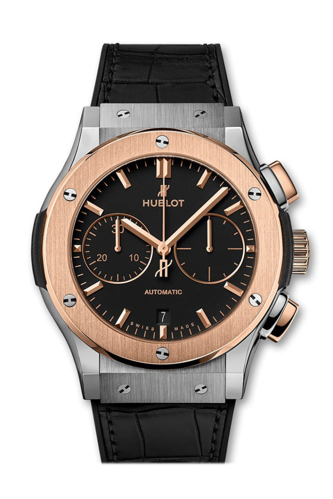 Titanium case with a black (alligator) leather / rubber backed strap. Fixed 18kt king gold bezel. Mat black dial with rose gold-tone hands and index hour markers. Minute markers around the outer rim. Dial Type: Analog. Date display at the 6 o'clock position. Chronograph - two sub-dials displaying: 60 seconds, 30 minute. Hublot calibre HUB1143 automatic movement with a 42-hour power reserve. Scratch resistant sapphire crystal. Pull / push crown. Transparent case back. Case size: 45 mm. Round case shape. Strap width: 20 mm. Fold over clasp. Water resistant at 50 meters / 165 feet. Functions: chronograph, date, hour, minute, second. Luxury watch style. Watch label: Swiss Made. Hublot Classic Fusion Automatic Chronograph Mens Watch 521.NO.1181.LR