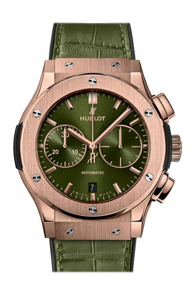 Hublot Classic Fusion Chronograph 45mm Mens Watch 521.OX.8980.LR Round Case Shape 45mm Case Dimensions 18kt Rose Gold Case Material Green Dial Color Scratch Resistant Sapphire Crystal Fixed Bezel 50m/150ft Water Resistance Transparent Case Back Alligator/Crocodile Leather Band Material Green Color/Finish Push Button Folding Clasp Automatic Movement Chronograph Complications