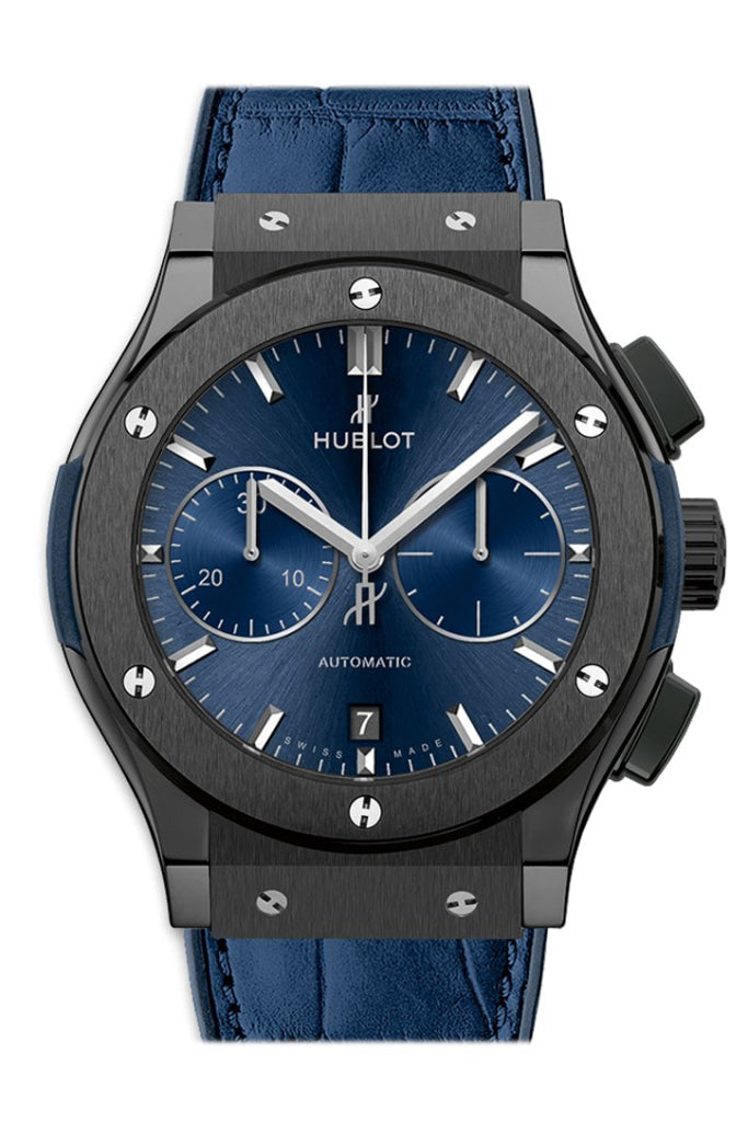 Black ceramic case with a blue (alligator) leather (rubber backed) strap. Fixed black ceramic bezel. Blue dial with silver-tone hands and index hour markers. Minute markers around the outer rim. Dial Type: Analog. Date display at the 6 o'clock position. Chronograph - two sub-dials displaying: 60 second and 30 minute. Hublot calibre HUB1143 automatic movement with a 42-hour power reserve. Scratch resistant sapphire crystal. Transparent case back. Round case shape. Case size: 45 mm. Black-plated stainless steel deployant clasp. Water resistant at 50 meters / 165 feet. Functions: chronograph, date, hour, minute, second. Luxury watch style. Watch label: Swiss Made. Hublot Classic Fusion Chronograph Automatic Mens Watch 521.CM.7170.LR.