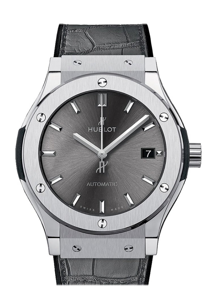 Titanium case with a grey alligator leather strap. Fixed bezel. Grey dial with silver-tone hands and index hour markers. Dial Type: Analog. Date display at the 3 o'clock position. Hublot Calibre HUB1110 automatic movement with about 42 hours of power reserve. Scratch resistant sapphire crystal. Pull / push crown. Solid case back. Case size: 42 mm. Round case shape. Water resistant at 50 meters / 165 feet. Functions: date, hour, minute, second. Luxury watch style. Watch label: Swiss Made. Hublot Classic Fusion Grey Dial Automatic Mens Watch 542.NX.7071.LR.
