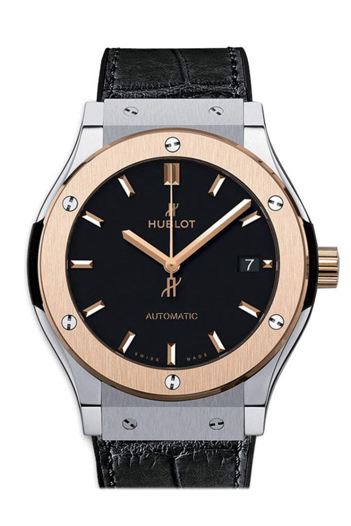 Titanium case with a alligator outer / rubber inner strap. Fixed bezel. Mat black dial with rose gold-tone hands and index hour markers. Dial Type: Analog. Date display at the 3 o'clock position. Automatic movement. Caliber hub1110 engine. Scratch resistant sapphire crystal. Pull / push crown. Skeleton transparent exhibition see through case back. Case diameter: 42 mm. Round case shape. Water resistant at 50 meters / 165 feet. Functions: date, hour, minute, second. Luxury watch style. Watch label: Swiss Made. Hublot Classic Fusion Mat Black Dial Automatic Men's Watch 542.NO.1181.LR