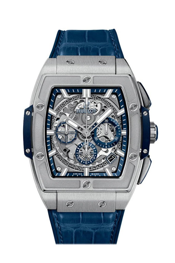 Titanium case with a blue alligator leather strap. Fixed titanium bezel. Silver-tone dial with silver-tone hands and index hour markers. Dial Type: Analog. Date display between 4 and 5 o'clock position. Chronograph - sub-dials displaying: three - 60 second, 30 minute and 12-hour. Hublot Calibre HUB4700 automatic movement with a 50-hour power reserve. Scratch resistant sapphire crystal. Transparent case back. Tonneau case shape. Case size: 42 mm. Titanium and black-plated titanium deployant buckl clasp. Water resistant at 100 meters / 330 feet. Functions: chronograph, date, hour, minute, second. Luxury watch style. Watch label: Swiss Made. Hublot Spirit of Big Bang Chronograph Automatic Silver Dial Mens Watch