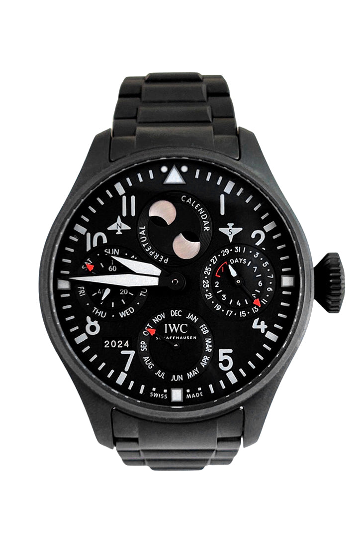 The IWC Big Pilot’s Watch Perpetual Calendar TOP GUN Ceratanium IW503604 is a 46.2mm automatic timepiece that combines cutting-edge materials with advanced horology. It features a Ceratanium® case and bracelet, offering the lightness of titanium with the scratch resistance of ceramic. Movement: IWC-manufactured 52615 calibre, featuring a 7-day power reserve. Perpetual Calendar: Automatically accounts for leap years and varying month lengths, functioning without adjustment until 2100. Moon Phase Display: Shows the moon’s position for both hemispheres, with a deviation of only one day in 577.5 years.