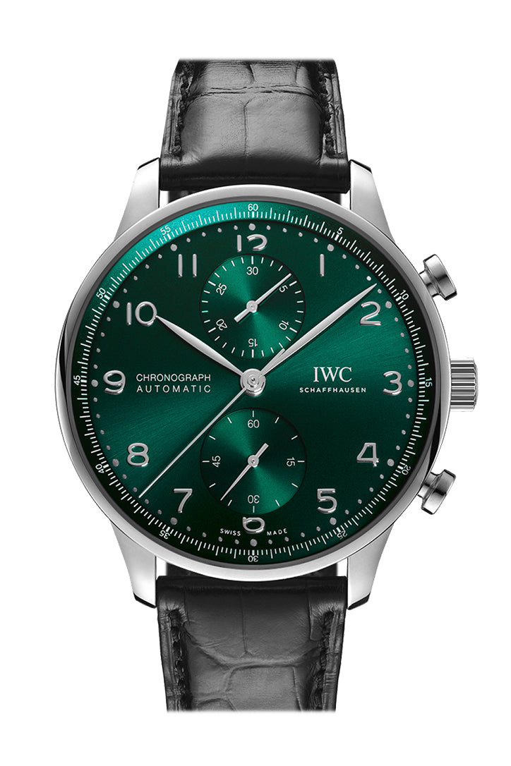 The IWC Portuguese Chronograph IW371615 is a timeless masterpiece, showcasing a 41mm stainless steel case paired with a stunning green sunburst dial. Its elegant design includes slim feuille hands and applied Arabic numerals, exuding classic sophistication. Powered by the IWC-manufactured Caliber 69355 automatic movement, it offers precision and a 46-hour power reserve. A black alligator leather strap completes the look, making it a perfect blend of elegance and performance.