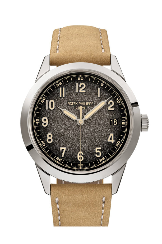 Patek Philippe Calatrava Textured Charcoal Gray White Gold Watch 5226G-001 Self-winding mechanical movement. Caliber 26‑330 S C. Date in an aperture. Sweep seconds. Dial Textured charcoal gray, black gradient rim, gold applied numerals with beige luminescent coating. Case White gold. Sapphire crystal case back. Water-resistant to 30 m. Diameter: 40 mm. Height: 8.53 mm. Bracelet Strap Calfskin, nubuck finish, hand-stitched, beige (originally fitted). Calfskin, embossed with fabric pattern, hand-stitched, black (additional strap). Prong buckle26-330 S C Self-Winding Date in an aperture. Sweep seconds. Diameter: 27 mm. Height: 3.30 mm. Parts: 212. Jewels: 30. Power reserve: min. 35 hours – max. 45 hours. Winding rotor: 21K gold central rotor. Balance: Gyromax®. Semi-oscillation/hour: 28 800 (4 Hz). Balance spring: Spiromax®. Hallmark: Patek Philippe Seal.