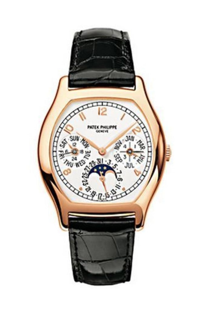 18kt rose gold case with a black crocodile leather strap. Fixed 18kt rose gold bezel. White dial with gold-tone Breguet-style shape hands and Arabic numerals hour markers. Minute markers around the outer rim. Dial Type: Analog. Perpetual calendar day, date, month, year, moon-phase. Day, month, 24 hour indicator, moon phase, leap year cycle subdials. Patek Philippe Calibre 240 Q Automatic movement, containing 27 Jewels, composed of 275 parts, bitting at 21600 vph, and has a power reserve of approximately 48 hours. Scratch resistant sapphire crystal. Sapphire crystal see through case back. Tonneau case shape. Case size: 35.6 mm. Deployment clasp. Water resistant at 30 meters / 100 feet. Functions: leap year, month, date, day, hour, minute, second, moonphase, GMT, perpetual calendar, grand complication. Luxury watch style. Watch label: Swiss. Item Variations: 5040R. Patek Philippe Complicated Perpetual Calendar 18kt Rose Gold Mens Watch