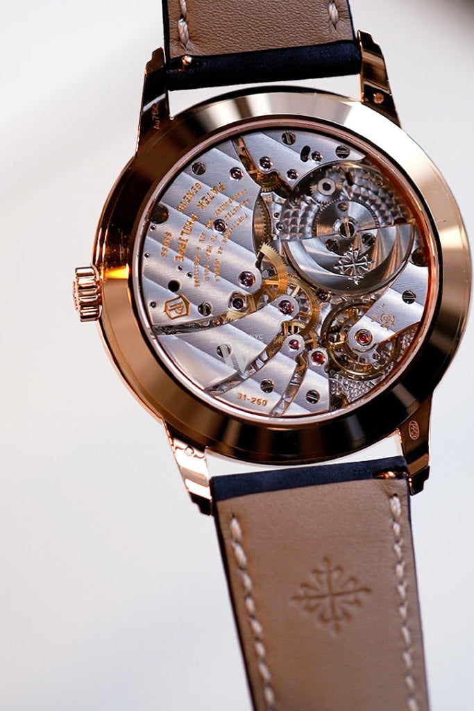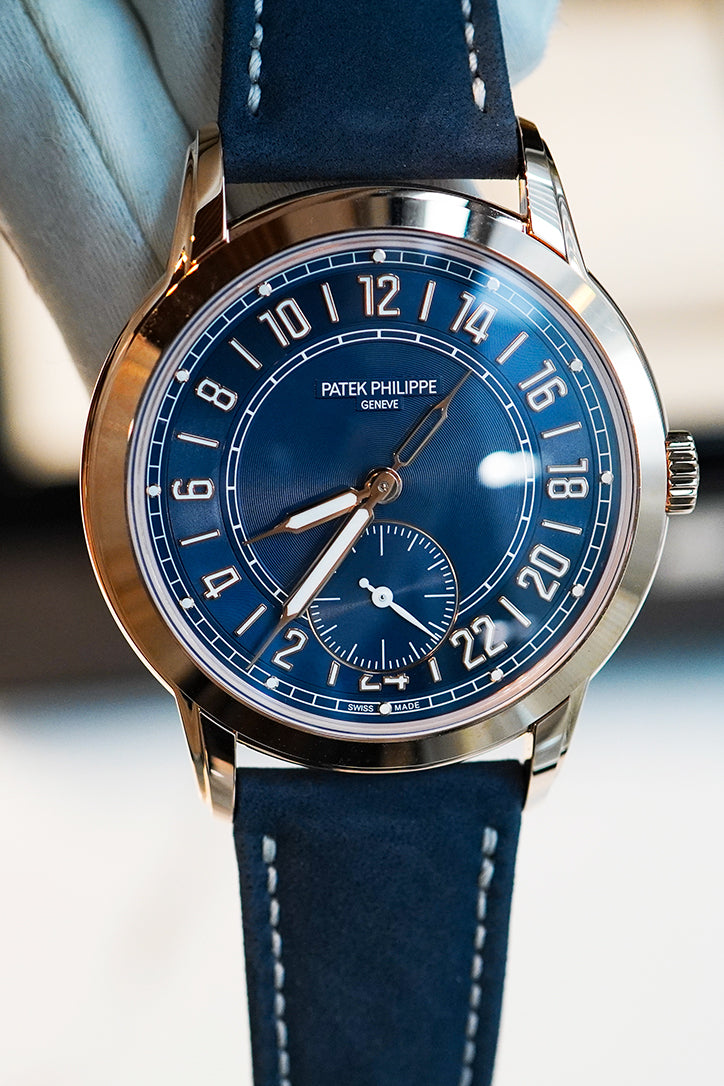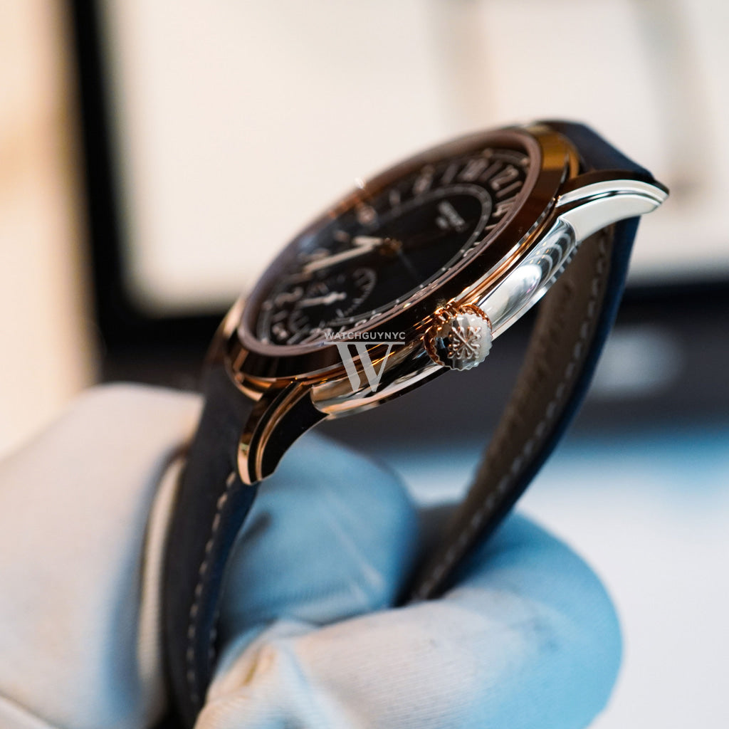 Patek Philippe Complication Blue Dial Watch 5224R-001 enriches its range of travel watches and complications for everyday use with a new self-winding Calatrava Travel Time model featuring a distinctive 24-hour display. Self-winding mechanical movement. Caliber 31‑260 PS FUS 24H. Dual time zone: local and home time indication. 24-hour display. Small seconds. Blue dial, gold applied numerals and hour markers and cabochons with white luminescent coating. Rose gold Case. Sapphire crystal case back. Water-resistant to 30 m. Diameter: 42 mm. Height: 9.85 mm. Calfskin Strap, nubuck finish, hand-stitched, navy blue. Prong buckle.