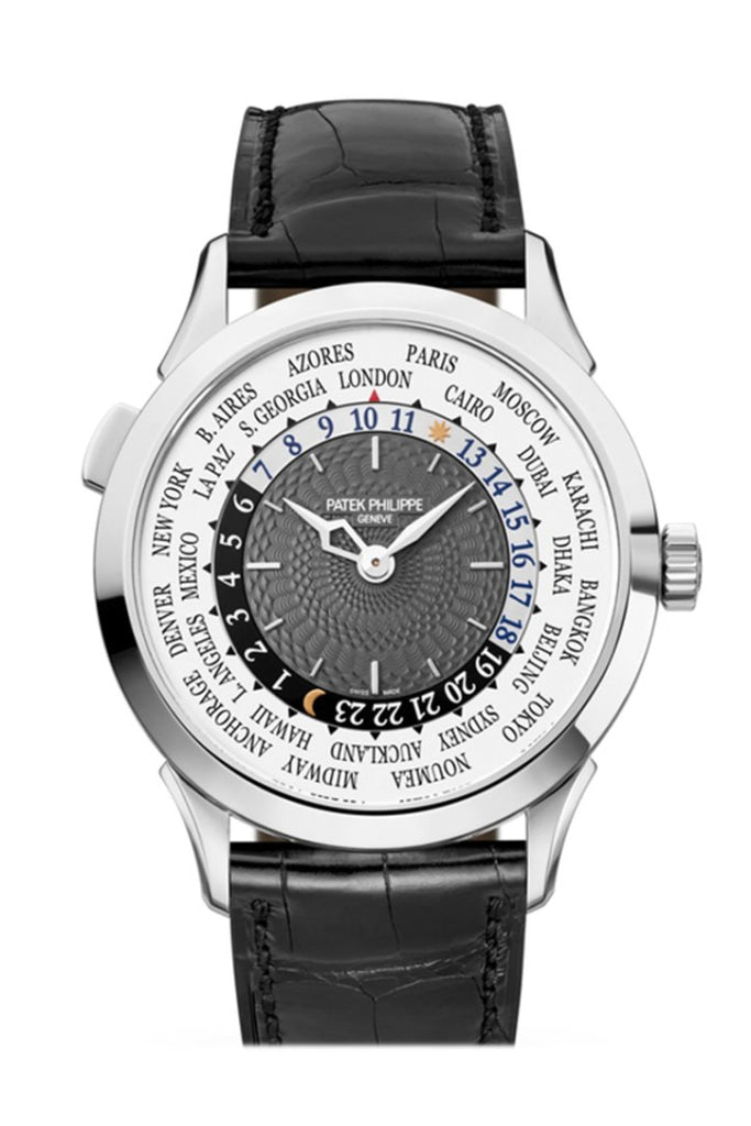 18kt white gold case with a black leather strap. Fixed 18kt white gold bezel. Charcoal gray dial with silver-tone hands and index hour markers. 24 hour (day / night) markers. World time cities around the outer rim. Dial Type: Analog. 240 HU automatic movement with a 48-hour power reserve. Scratch resistant sapphire crystal. Transparent case back. Case size: 38.5 mm. Round case shape. Fold over clasp. Water resistant at 30 meters / 100 feet. Functions: hour, minute, am/pm indicator for 24 time zones. Luxury watch style. Watch label: Swiss Made. Patek Philippe Complications 18K White Gold Automatic Mens Watch