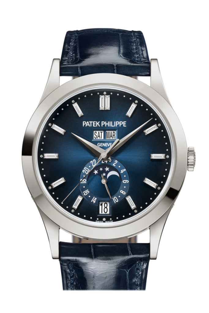 Self-winding mechanical movement. Caliber 26‑330 S QA LU 24H. Annual Calendar. Day, date and month in apertures. Moon phases. 24-hour indication. Sweep seconds. Dial Sunburst blue with black-gradient rim, baguette-cut diamond hour markers (0.26 ct). Case White gold. Diameter: 38.5 mm. Thickness: 11.2 mm. Water-resistant to 30 m. Sapphire crystal case back. Strap Alligator leather with square scales, hand-stitched, shiny navy blue. Fold-over clasp in white gold. Patek Philippe Complications Annual Calendar Moon Phases White Gold Blue Dial Watch 5396G 5396G-017