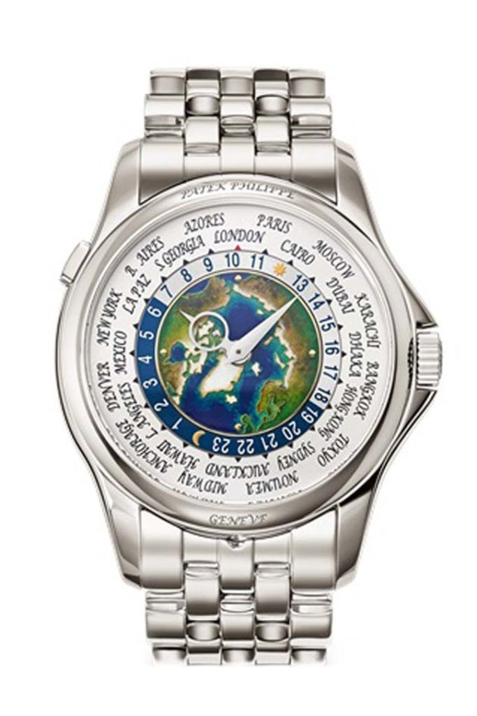Silver-tone platinum case with a silver-tone platinum bracelet. Fixed silver-tone platinum bezel. Blue dial with silver-tone hands and Arabic numeral hour markers. Dial Type: Analog. Patek Philippe Calibre 280 HU automatic movement with a 48-hour power reserve. Scratch resistant sapphire crystal. Pull / push crown. Transparent case back. Round case shape, case size: 39.5 mm, case thickness: 10 mm. Band width: 20 mm, band length: 8 inches. Fold over clasp. Water resistant at 30 meters / 100 feet. Functions: hours, minutes, small seconds, world time. Luxury watch style. Patek Philippe World Time Automatic Blue Dial Mens Watch 5131/1P-001