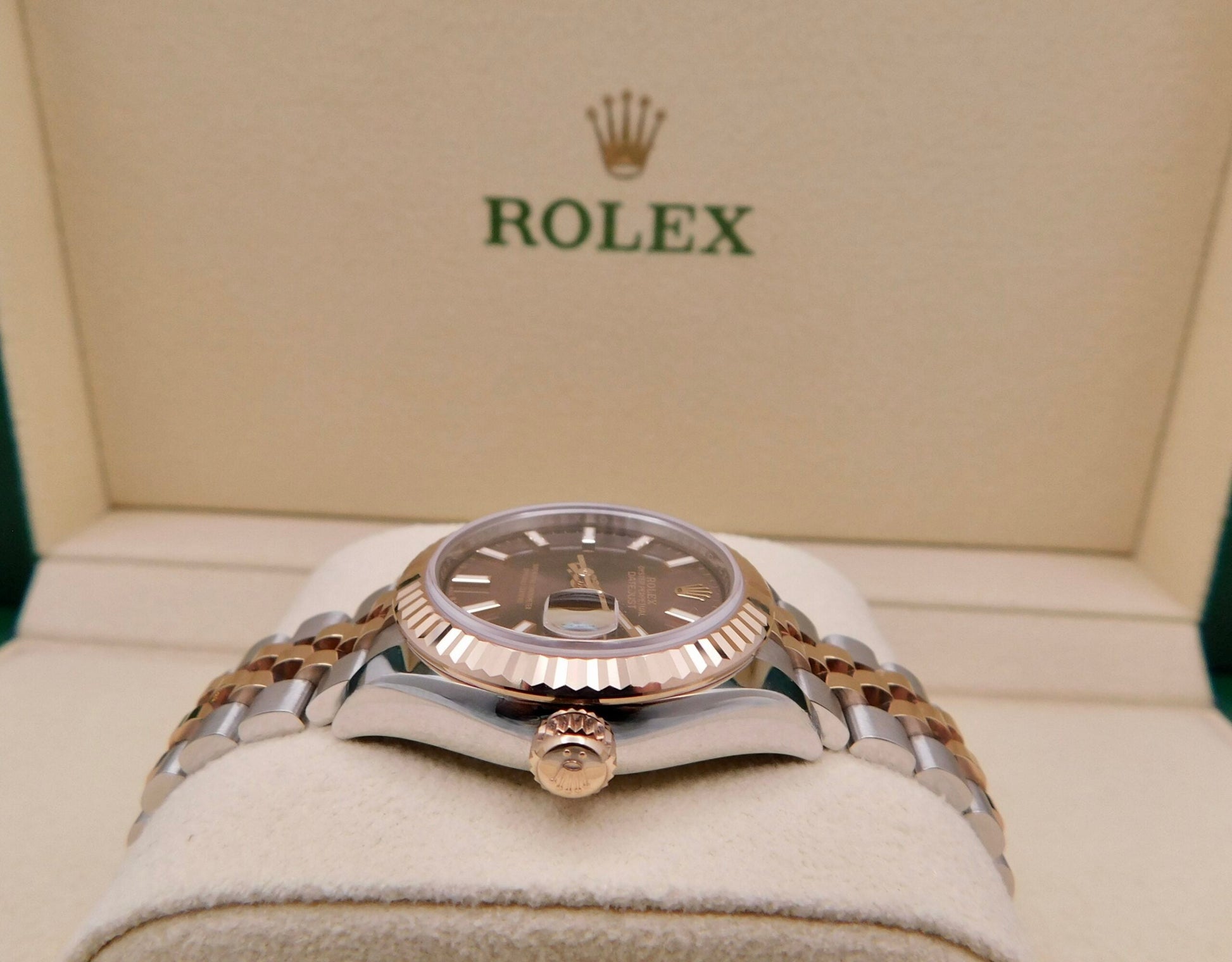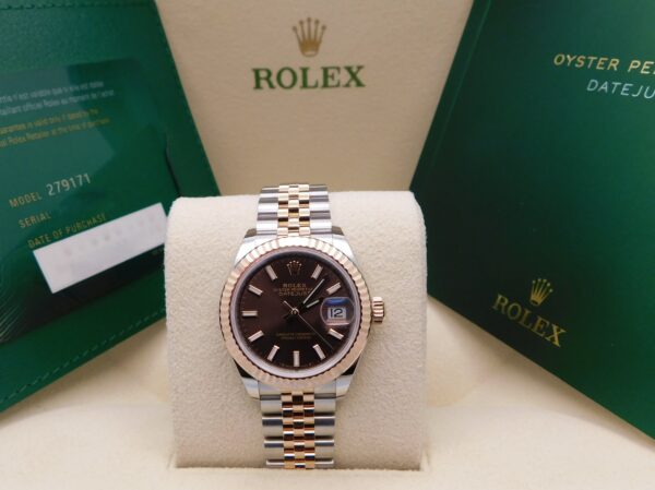 - Brand: RolexModel: DatejustReference Number: Gender: Woman’sMetal: 18K Yellow Gold & Stainless SteelCase Size: 28.00mmWrist Size: Please contact us prior to purchasing this item if the removal of links is necessary.Movement: Original Rolex Swiss Automatic Movement.Crystal: Original Rolex Scratch-Resistant Sapphire.Dial: Original Rolex Chocolate Index Dial with the date at 3 o’clock.Bezel: Original Yellow Gold Fluted Bezel.Band: Original Rolex Yellow Gold & Stainless Steel Jubilee Band.Box: YESPapers: YES