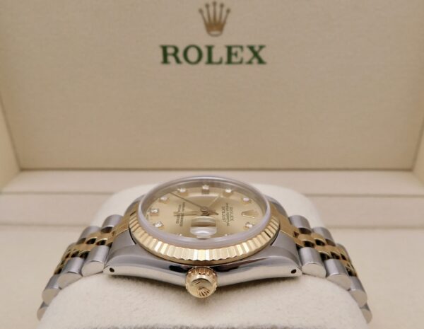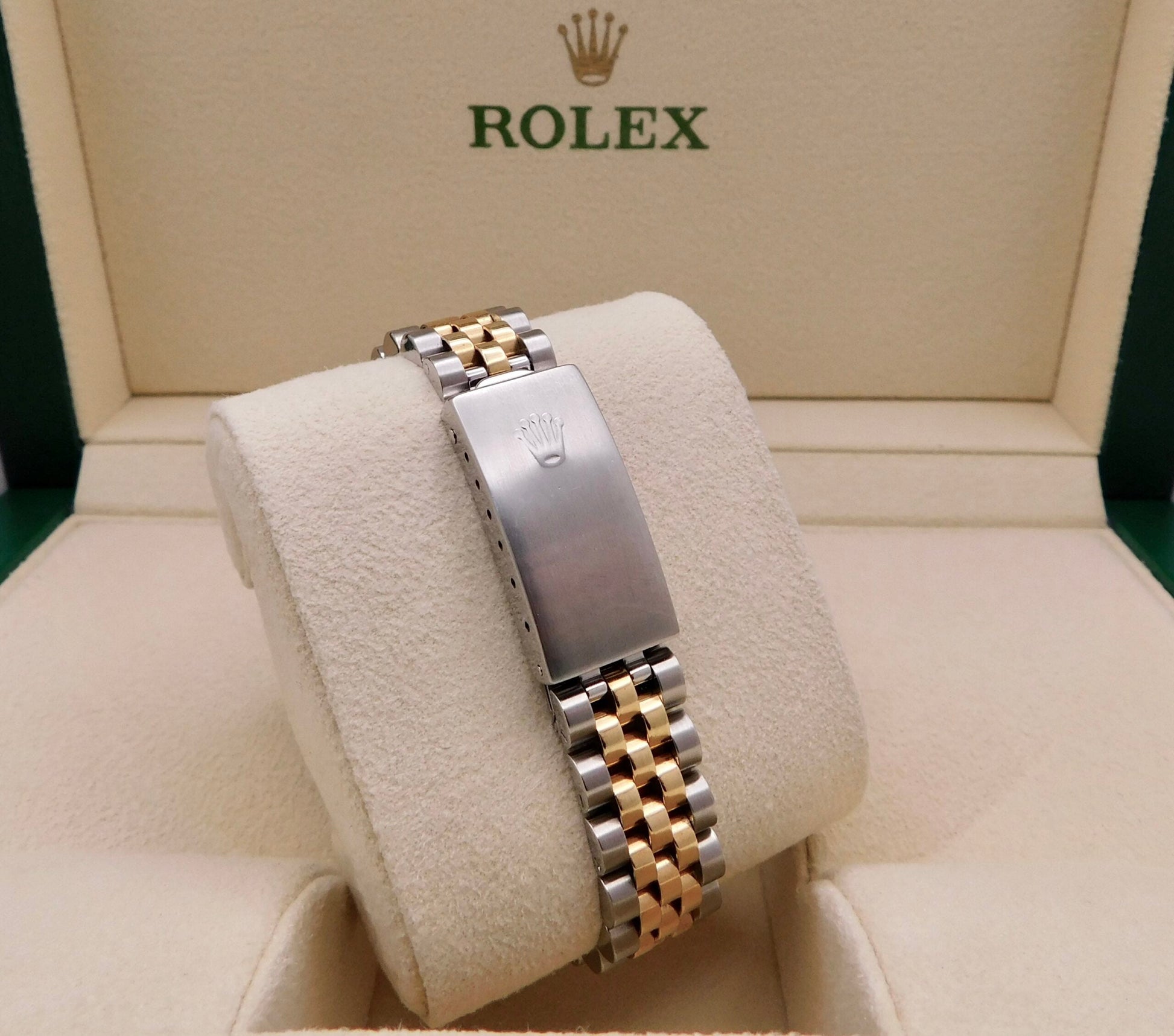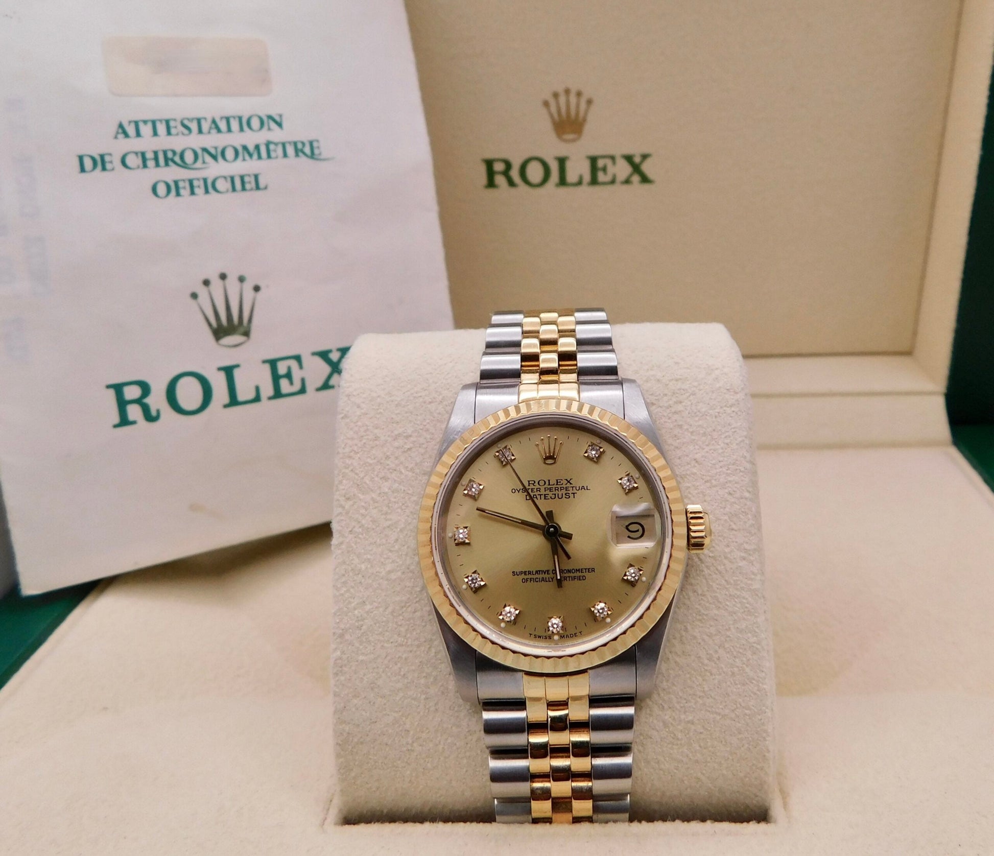 - Brand: RolexModel: DatejustReference Number: 68273Gender: Woman’sMetal: 18K Yellow Gold & Stainless SteelCase Size: 31.00mmWrist Size: Please contact us prior to purchasing this item if the removal of links is necessary.Movement: Original Rolex Swiss Automatic Movement.Crystal: Original Rolex Scratch-Resistant Sapphire.Dial: Original Rolex Champagne Diamond Dial with the date at 3 o’clock.Bezel: Original Yellow Gold Fluted Bezel.Band: Original Rolex Yellow Gold & Stainless Steel Jubilee Band.Box: YESPapers: YES