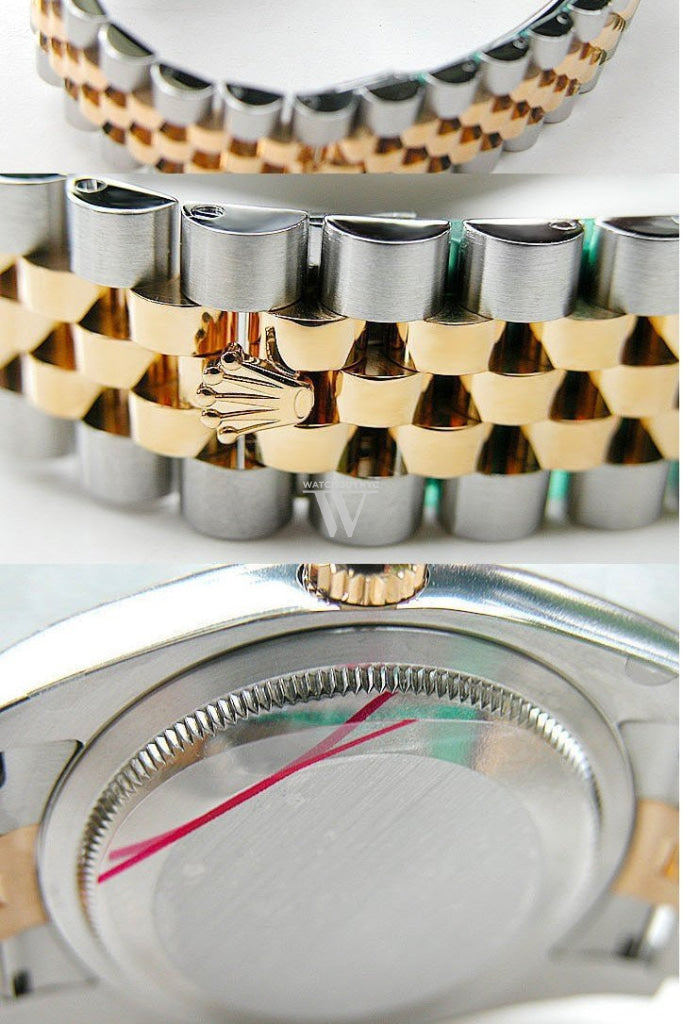 Stainless steel case with a stainless steel Rolex jubilee bracelet with 18kt yellow gold center links. Fixed fluted 18kt yellow gold bezel. Black jubilee dial with yellow gold-tone hands and Roman numeral hour markers. Dial Type: Analog. Date display at the 3 o'clock position. Rolex calibre 3135 automatic movement with a 50-hour power reserve. Scratch resistant sapphire crystal. Screw down crown. Solid case back. Case size: 36 mm. Round case shape. Hidden deployment clasp. Water resistant at 100 meters / 330 feet. Functions: date, hour, minute, second, chronometer. Additional Info: date displays at 3 o'clock position. Luxury watch style. Watch label: Swiss Made. Item Variations: 116233, 116233-BKJRJ, Rolex-116233, Rolex-116233-BKJRJ. Rolex Oyster Perpetual Datejust 36 Black Dial Stainless Steel and 18K Yellow Gold Jubilee Bracelet Automatic Mens Watch 116233