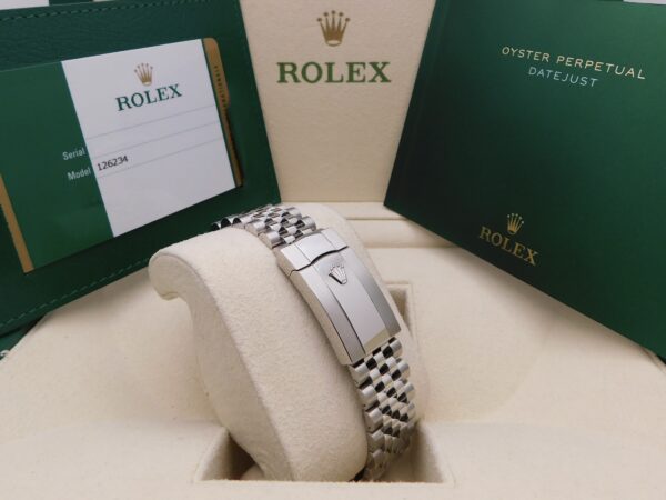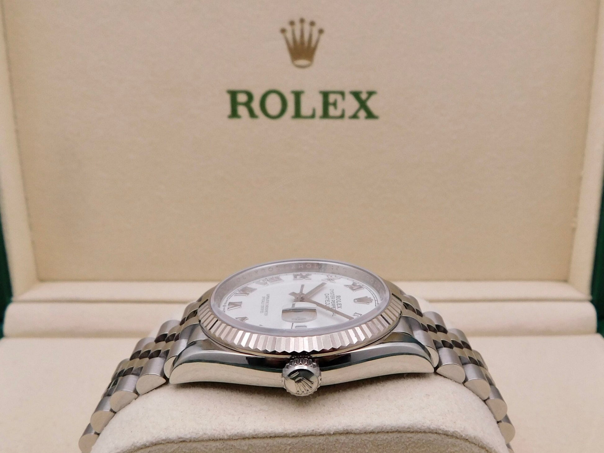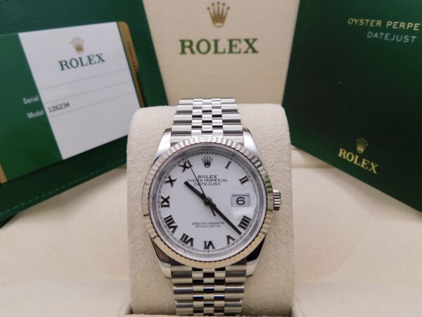 - Brand: RolexModel: DatejustReference Number: 126234Gender: Woman’sMetal: 18K White Gold & Stainless SteelCase Size: 36.00mmWrist Size: Please contact us prior to purchasing this item if the removal of links is necessary.Movement: Original Rolex Swiss Automatic Movement.Crystal: Original Rolex Scratch-Resistant Sapphire.Dial: Original Rolex White Roman Dial with the date at 3 o’clock.Bezel: Original White Gold Fluted Bezel.Band: Original Rolex Yellow Gold & Stainless Steel Jubilee Band.Box: YESPapers: YES