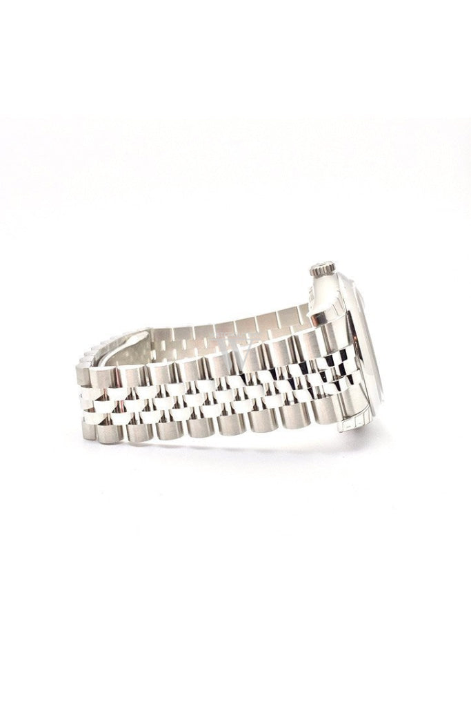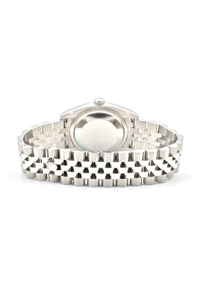 Stainless steel case with a stainless steel rolex jubilee bracelet. Fixed - domed stainless steel bezel. Silver dial with silver-tone hands and oversized 9 and 6 Arabic numeral hour markers. Dial Type: Analog. Date display at the 3 o'clock position. Rolex Calibre 3135 automatic movement with about 50 hours of power reserve. Scratch resistant sapphire crystal. Screw down crown. Solid case back. Case size: 36 mm. Round case shape. Water resistant at 100 meters / 330 feet. Functions: date, hour, minute, second. Dress watch style. Watch label: Swiss Made. Rolex Datejust 36 Silver Dial Stainless Steel Rolex Jubilee Automatic Mens Watch. 116200