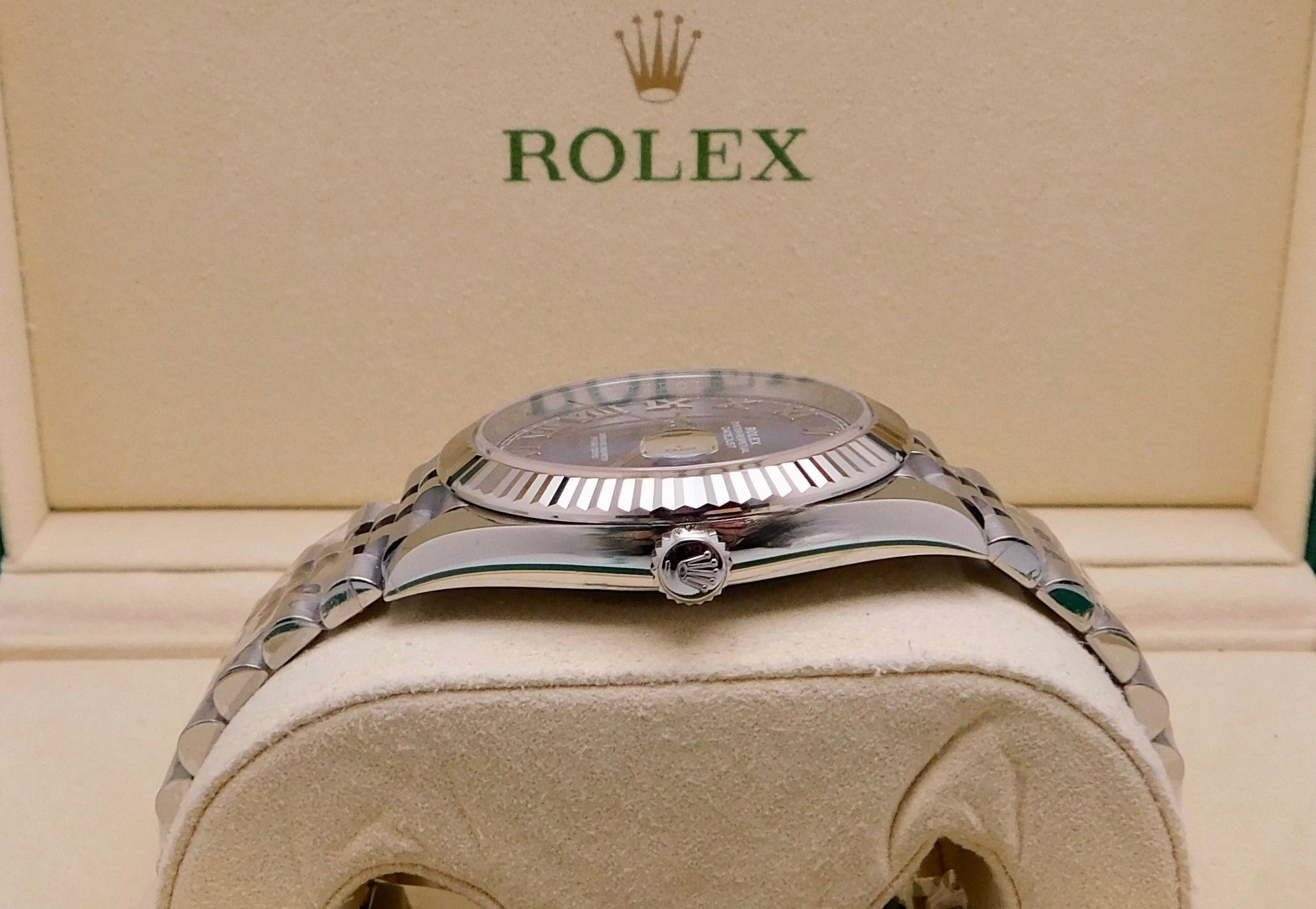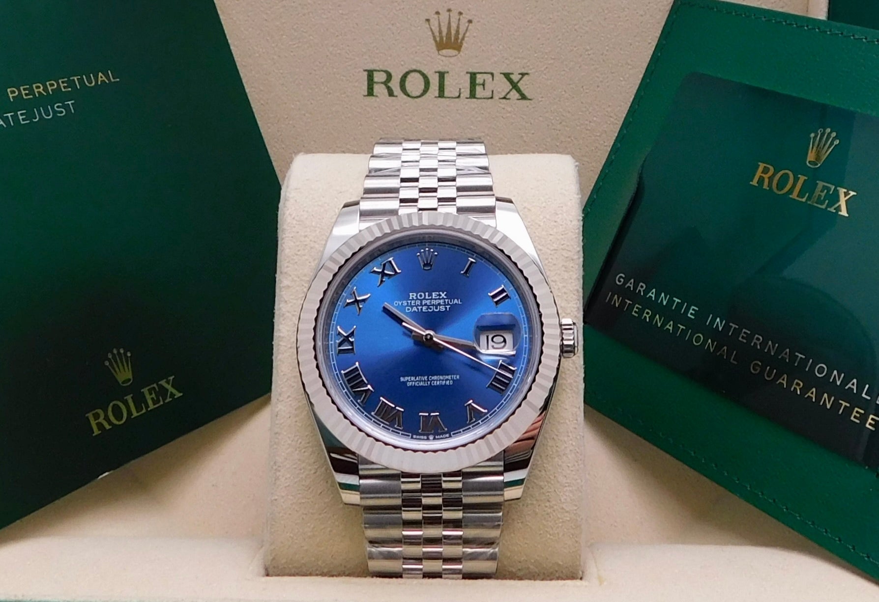 - Brand: RolexModel: DatejustReference Number: 126334Gender: MensMetal: Stainless SteelCase Size: 41.00mmWrist Size: Please contact us prior to purchasing this item if the removal of links is necessary.Movement: Original Rolex Swiss Automatic Movement.Crystal: Original Rolex Scratch-Resistant Sapphire.Dial: Original Rolex Blue Roman Dial with the date at 3 o’clock.Bezel: Original Rolex White Gold Fluted Bezel.Band: Original Rolex Stainless Steel Jubilee Band.Box: YESPapers: YES (Card)