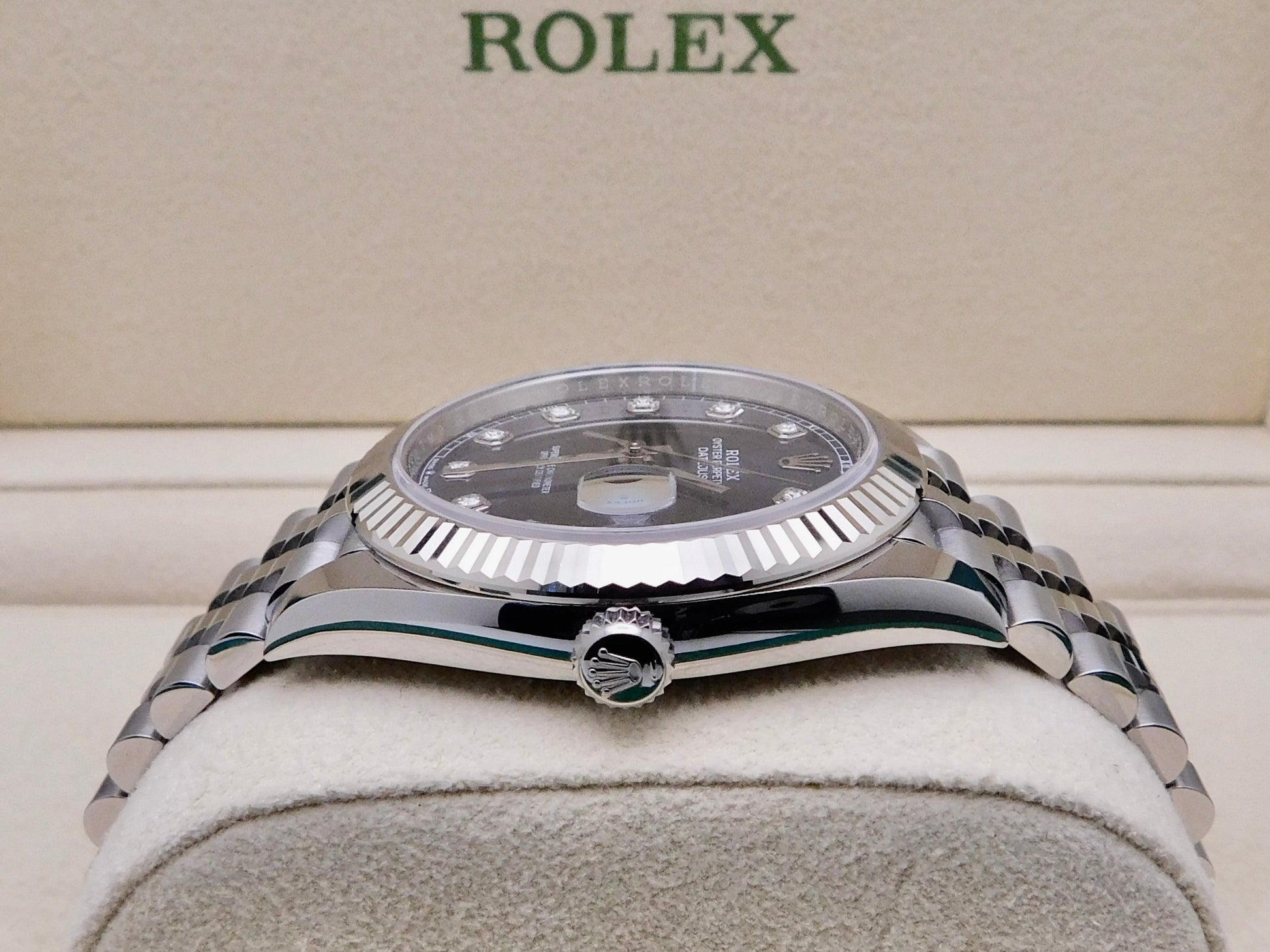 - Brand: RolexModel: DatejustReference Number: 126334Gender: Men’sMetal: Stainless SteelCase Size: 41.00mmWrist Size: Please contact us prior to purchasing this item if the removal of links is necessary.Movement: Original Rolex Swiss Automatic Movement.Crystal: Original Rolex Scratch-Resistant Sapphire.Dial: Original Rolex Blue Diamond Dial with the date at 3 o’clock.Bezel: Original Rolex White Gold Fluted Bezel.Band: Original Rolex Stainless Steel Jubilee Band.Box: YESPapers: YES
