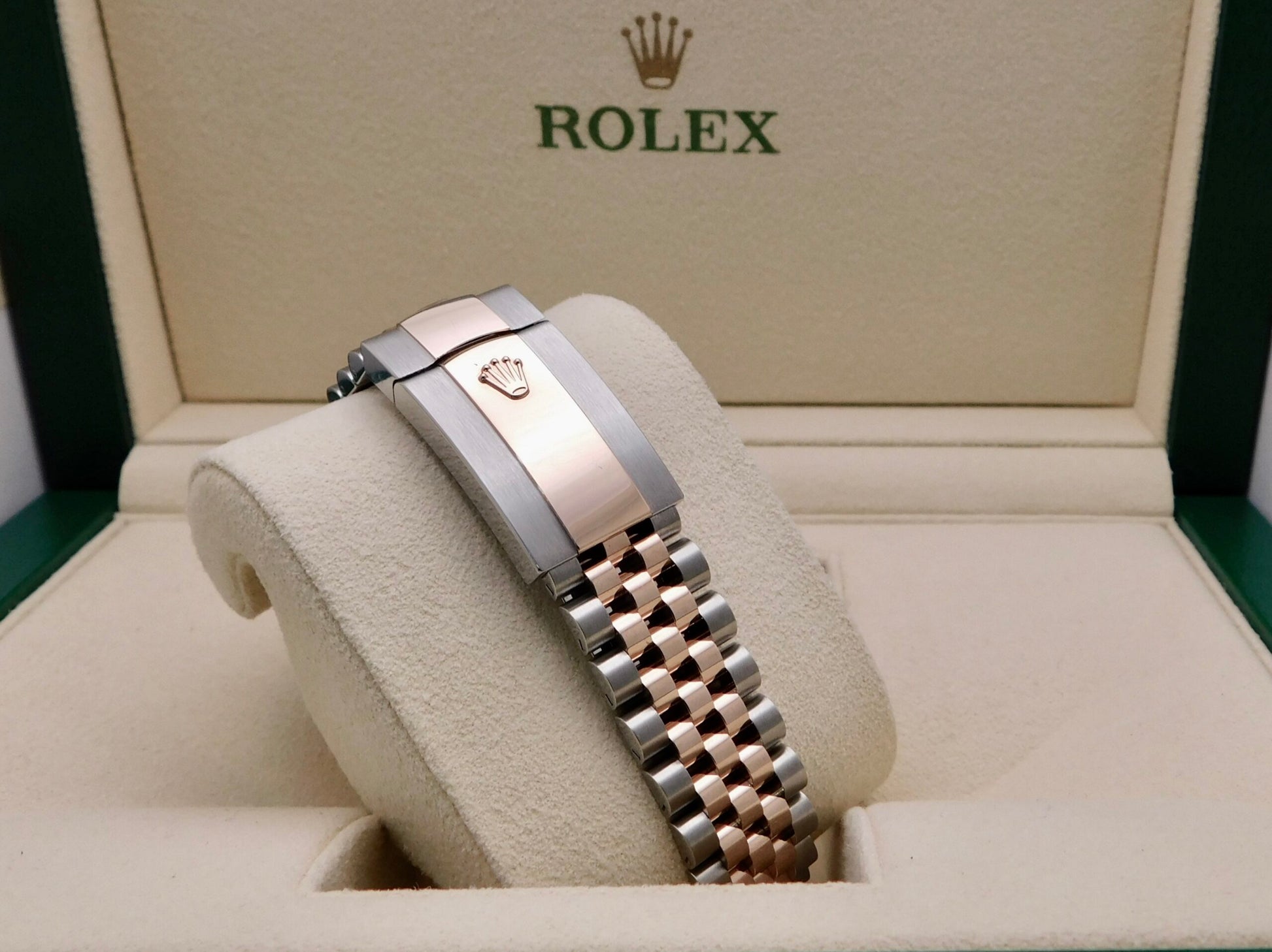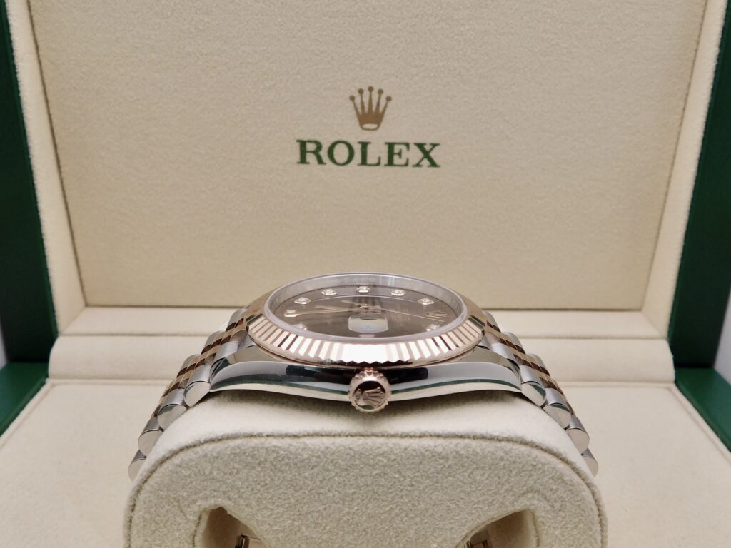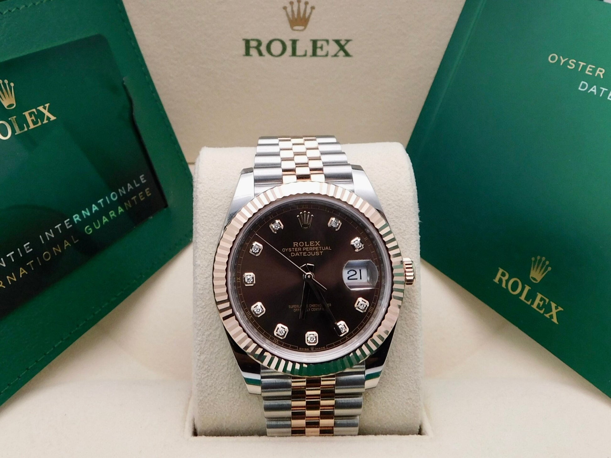 - Brand: RolexModel: DateJustReference Number: 126331Gender: WemansMetal: 18K Rose Gold & Stainless SteelCase Size: 41.00mmWrist Size: Please contact us prior to purchasing this item if the removal of links is necessary.Movement: Original Rolex Swiss Automatic Movement.Crystal: Original Rolex Scratch-Resistant Sapphire.Dial: Original Rolex Chocolate Diamond Dial with date 3 o’clock.Bezel: Original Rolex 18K Rose Gold Fluted Bezel.Band: Original Rolex 18K Rose Gold & Stainless Steel Band.Box: YESPapers: YES