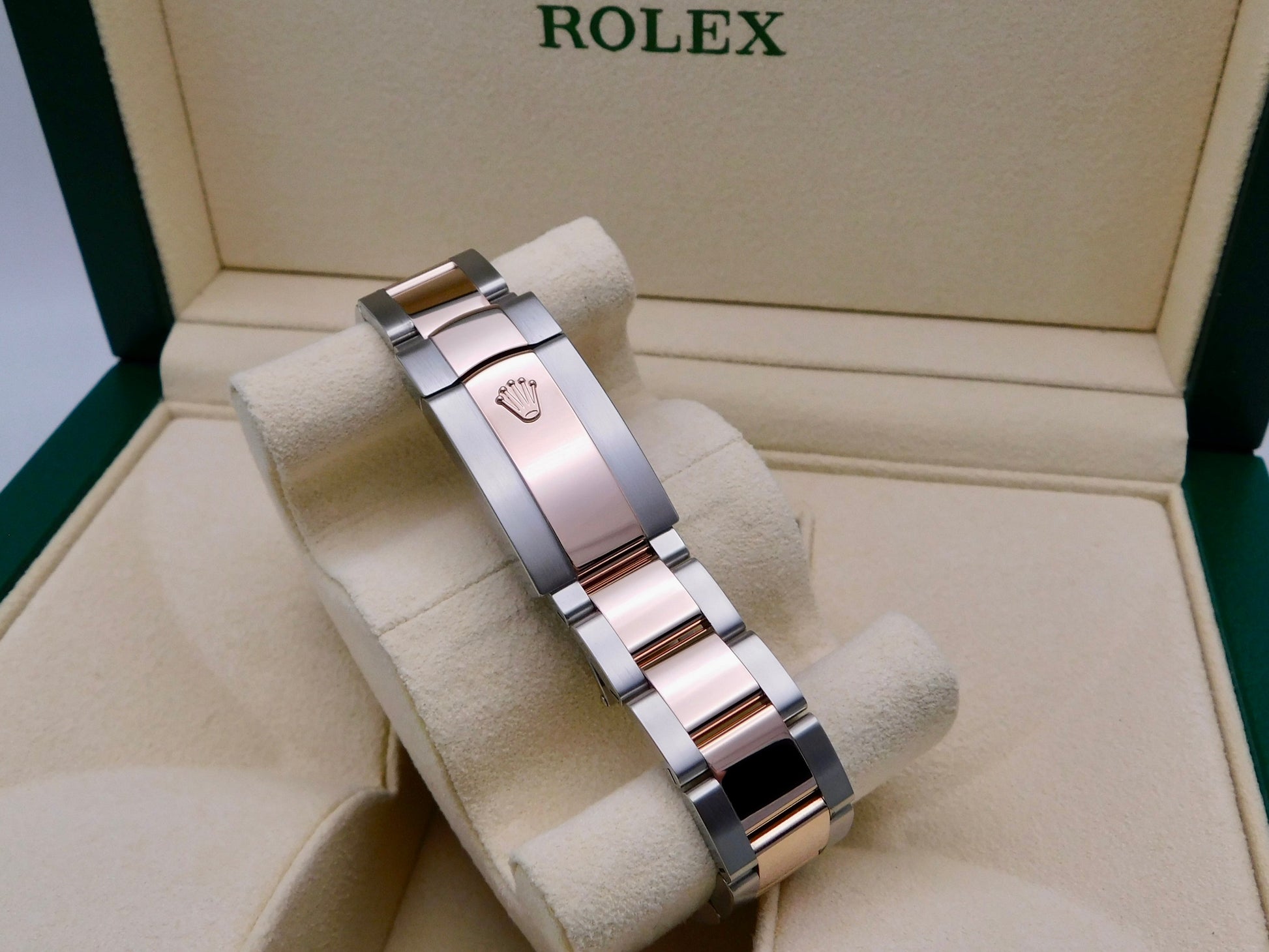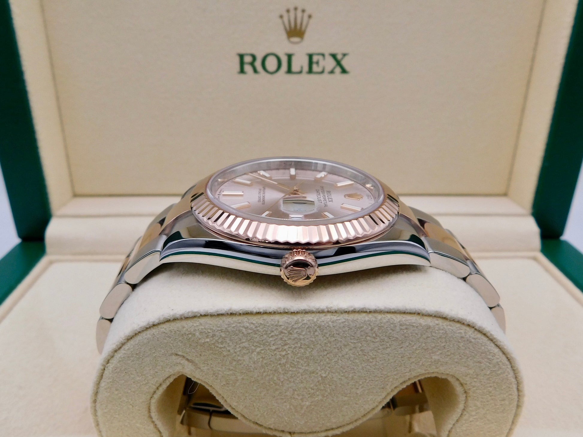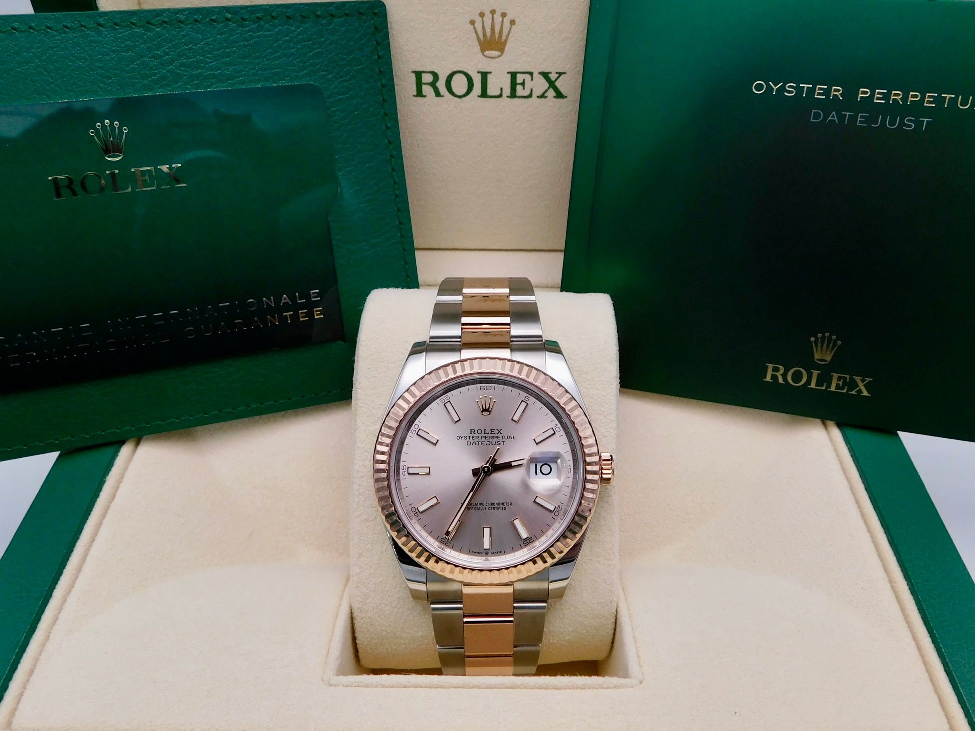 - Brand: RolexModel: DatejustReference Number: 126301Gender: Men’sMetal: 18K Rose Gold & Stainless SteelCase Size: 41.00mmWrist Size: Please contact us prior to purchasing this item if the removal of links is necessary.Movement: Original Rolex Swiss Automatic Movement.Crystal: Original Rolex Scratch-Resistant Sapphire.Dial: Original Rolex Sundust Index Dial with the date at 3 o’clock.Bezel: Original Rolex Rose Gold Fluted Bezel.Band: Original Rolex Rose Gold & Stainless Steel Oyster Band.Box: YESPapers: YES