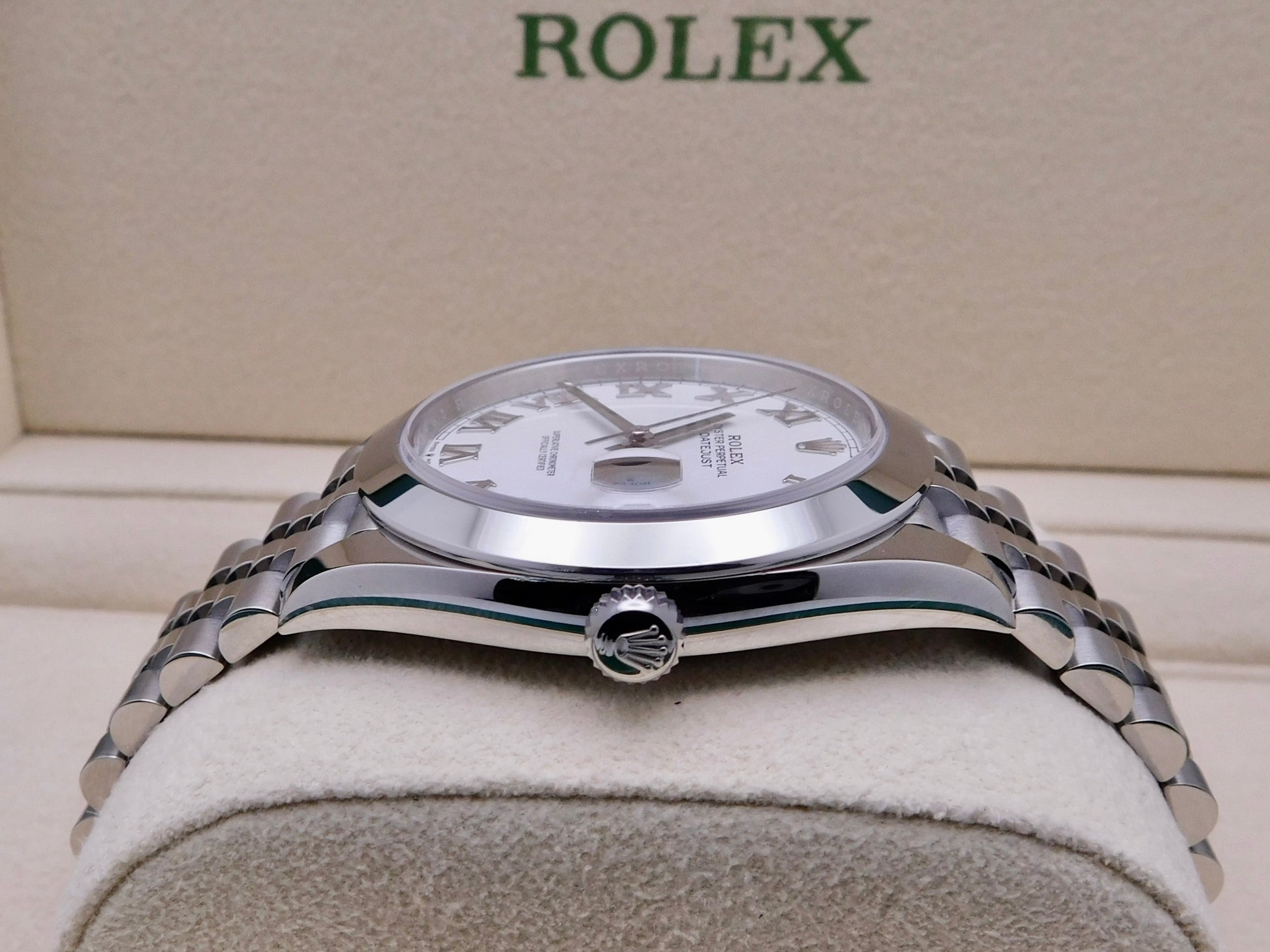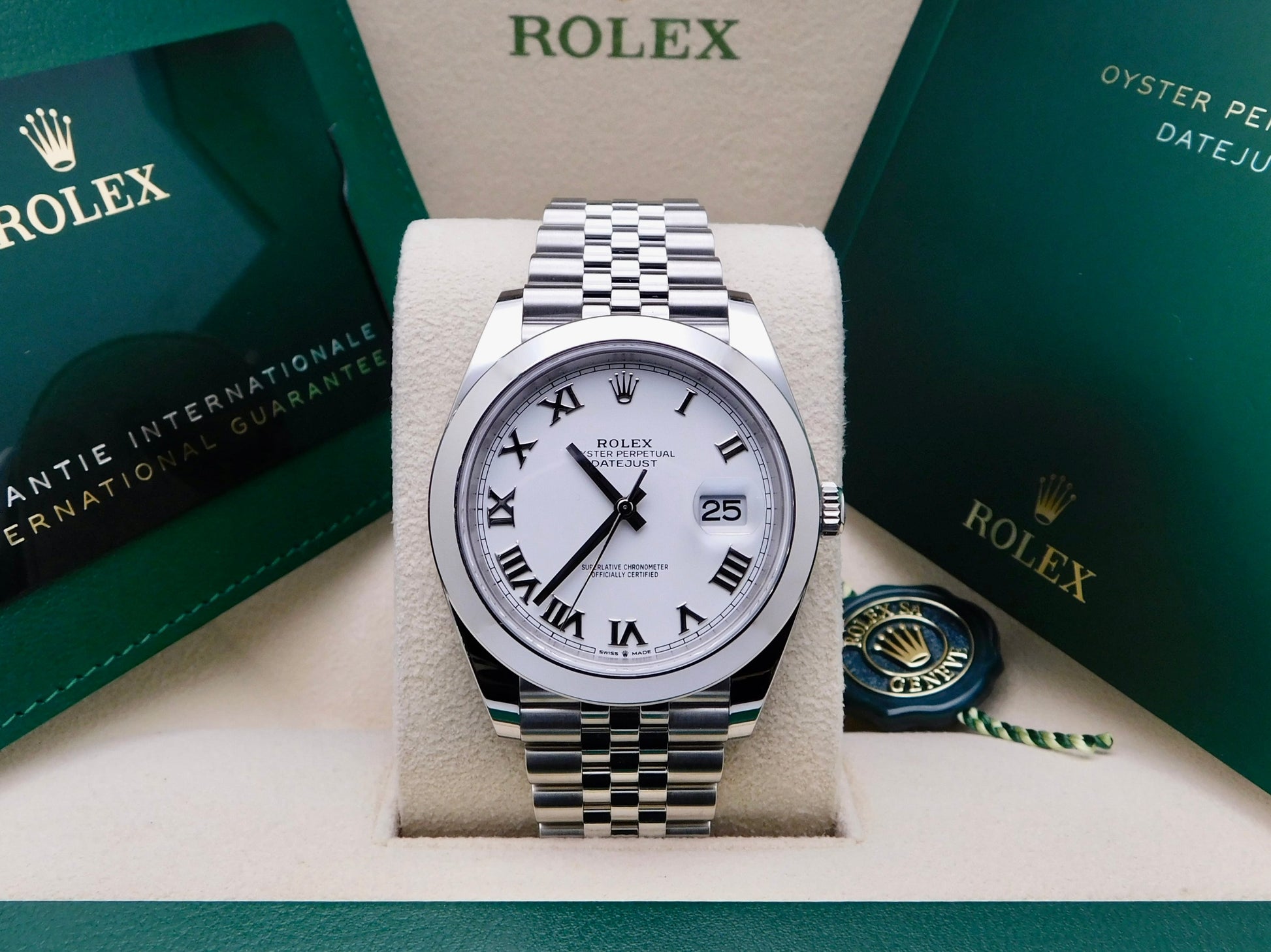 - Brand: RolexModel: DatejustReference Number: 126334Gender: MensMetal: Stainless SteelCase Size: 41.00mmWrist Size: Please contact us prior to purchasing this item if the removal of links is necessary.Movement: Original Rolex Swiss Automatic Movement.Crystal: Original Rolex Scratch-Resistant Sapphire.Dial: Original Rolex White Roman Dial with the date at 3 o’clock.Bezel: Original Rolex Stainless Steel Smooth Bezel.Band: Original Rolex Stainless Steel Jubilee Band.Box: YESPapers: YES