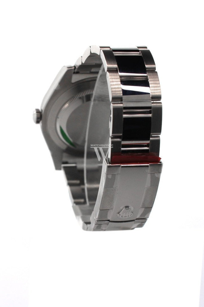 Stainless steel case with a stainless steel oyster bracelet. Fluted 18k white gold bezel. Blue dial with silver-tone hands and Roman numeral hour markers. Minute markers around the outer rim. Date display at the 3 o'clock position. Automatic movement. Scratch resistant sapphire crystal. Case diameter: 41 mm. Deployment clasp. Water resistant at 100 meters/330 feet. Functions: hours/ minutes/ seconds/ date. 116334