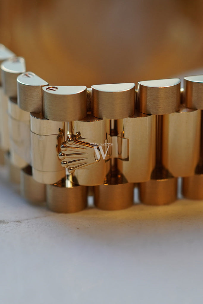 Rolex Yellow Gold Day-Date 36 Watch - Diamond Bezel - Turquoise Dial - President Bracelet 36mm 18K yellow gold case, screw-down back, screw-down crown with twinlock double waterproofness system, bezel set with 52 diamonds, scratch-resistant sapphire crystal with cyclops lens over the date, Turquoise dial, Diamond hour markers, Rolex calibre 3255 perpetual self-winding movement with centre hour, minute and seconds hands, instantaneous day and date in apertures, unrestricted rapid-setting, and stop-seconds for precise time setting, approximately 70 hours of power reserve, 18K yellow gold President bracelet with semi-circular three-piece links, concealed folding Crownclasp buckle. Waterproof to 100 meters. 128348RBR-0037 128348RBR