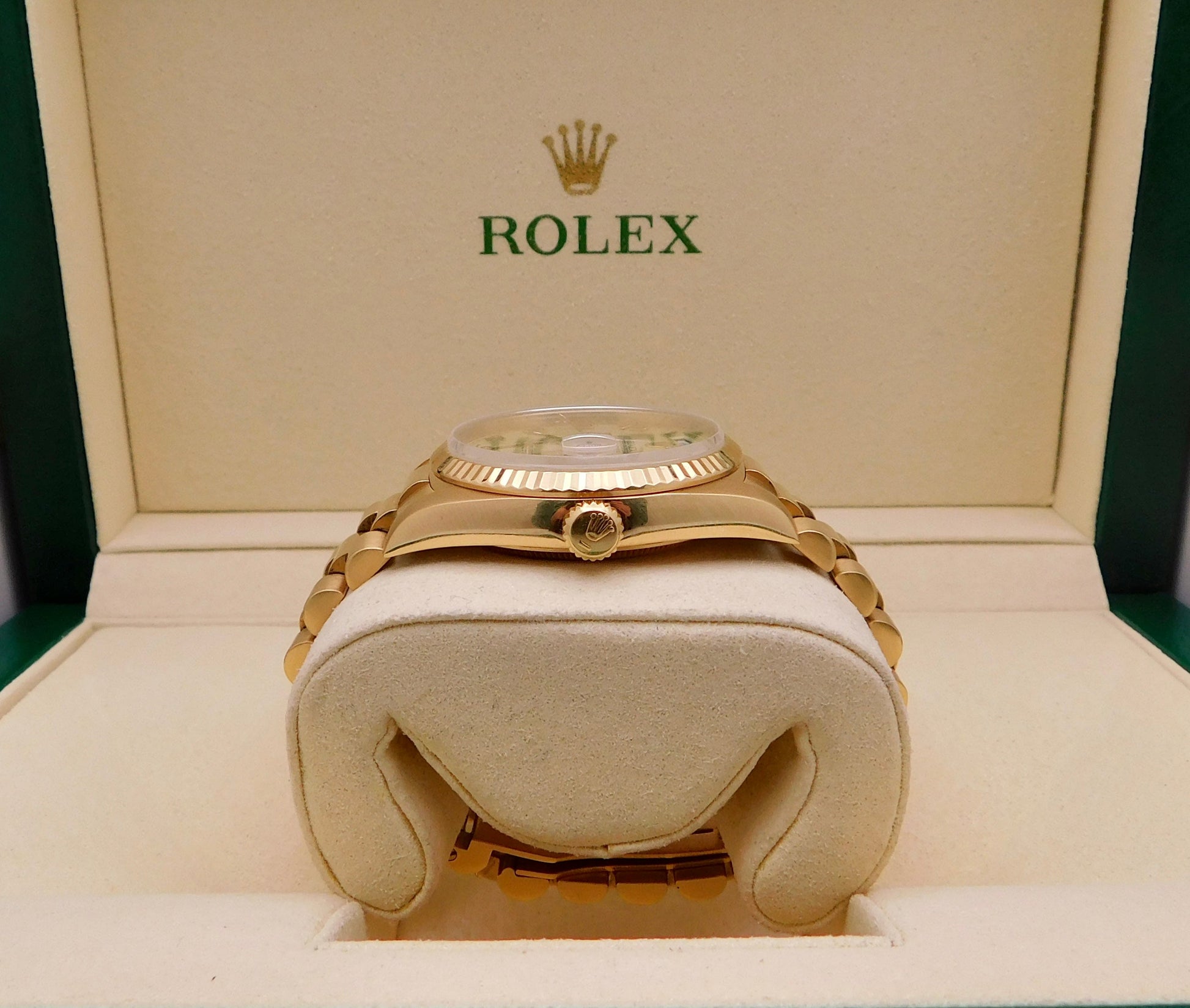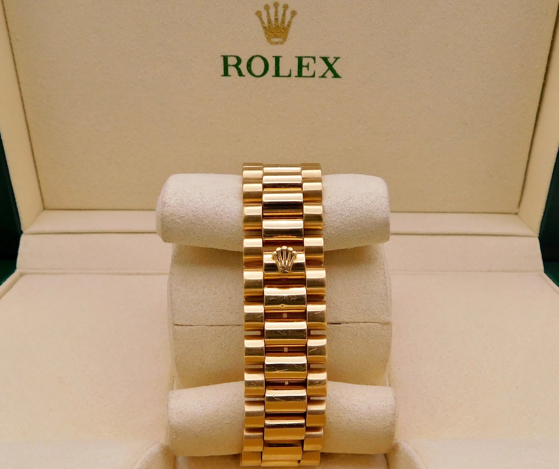 - Brand: RolexModel: Day-DateGender: Mens / UnisexMetal: Yellow GoldCase Size: 36.00mmWrist Size: Please contact us prior to purchasing this item if the removal of links is necessary.Movement: Original Rolex Swiss Automatic Movement.Crystal: Original Rolex Scratch-Resistant Sapphire.Dial: Original Rolex Champagne Arabic Dial with the day at 12 o'clock and date at 3 o’clock.Bezel: Original Yellow Gold Fluted Bezel.Band: Original Rolex Yellow Gold Presidential Band.Box: YESPapers: NO