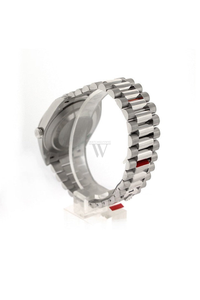 18k platinum case with a platinum Rolex President bracelet. Fixed - platinum bezel. Blue dial with silver tone hands and Roman hour markers. Minute markers around the outer rim. Dial Type: Analog. Date display at 3 o'clock; day display at 12 o'clock.. Automatic movement. 3255 engine. Scratch resistant sapphire crystal. Screw down crown. Solid case back. Case diameter: 40 mm. Round case shape. Concealed Crown clasp. Water resistant at 100 meters / 330 feet. Functions: date, day, hour, minute, second. Luxury watch style. Watch label: Swiss Made. Rolex Day-Date Blue Dial Platinum President Automatic Men's Watch. 228206