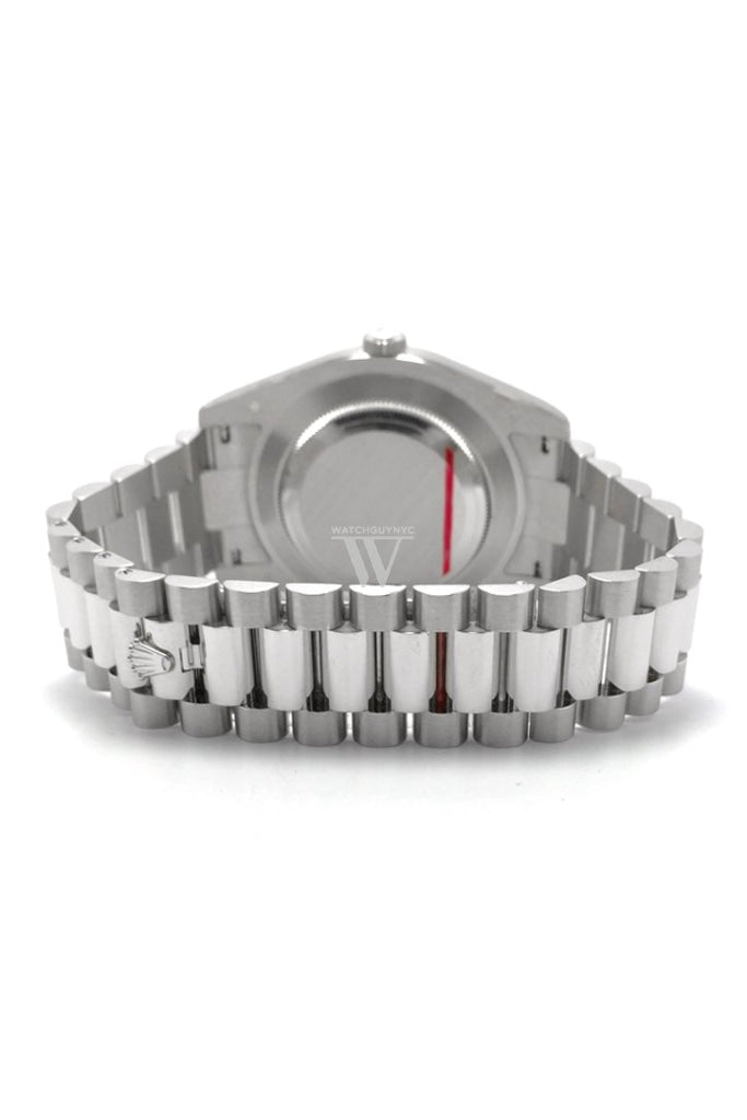 Platinum case with a platinum Rolex President bracelet. Fixed - domed platinum bezel. Ice blue dial with silver tone hands and Roman numeral hour markers. Minute markers around the outer rim. Dial Type: Analog. Date display at 3 o'clock; day display at 12 o'clock.. Automatic movement. Scratch resistant sapphire crystal. Screw down crown. Case diameter: 41 mm. Round case shape. Concealed Crown clasp. Water resistant at 100 meters / 330 feet. Functions: date, day, hour, minute, second. Luxury watch style. Watch label: Swiss Made. Rolex Day-Date II Ice Blue Dial Platinum President Automatic Men's Watch. 218206