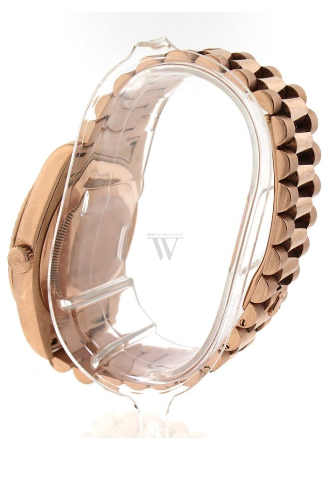 18kt rose gold case with a 18kt rose gold president bracelet. Fixed 18kt rose gold bezel. Black dial with rose gold-tone hands and Arabic numeral hour markers. Dial Type: Analog. Date display at the 3 o'clock position. Rolex Calibre 3156 automatic movement with a 48-hour power reserve. Scratch resistant sapphire crystal. Screw down crown. Solid case back. Round case shape, case size: 41 mm, case thickness: 13 mm. Band width: 21 mm. Crown clasp. Water resistant at 100 meters / 330 feet. Functions: date, day, hour, minute, second, chronometer. Luxury watch style. Watch label: Swiss Made. Pre-owned Rolex Day-Date II Automatic Chronometer Men's Watch 218235