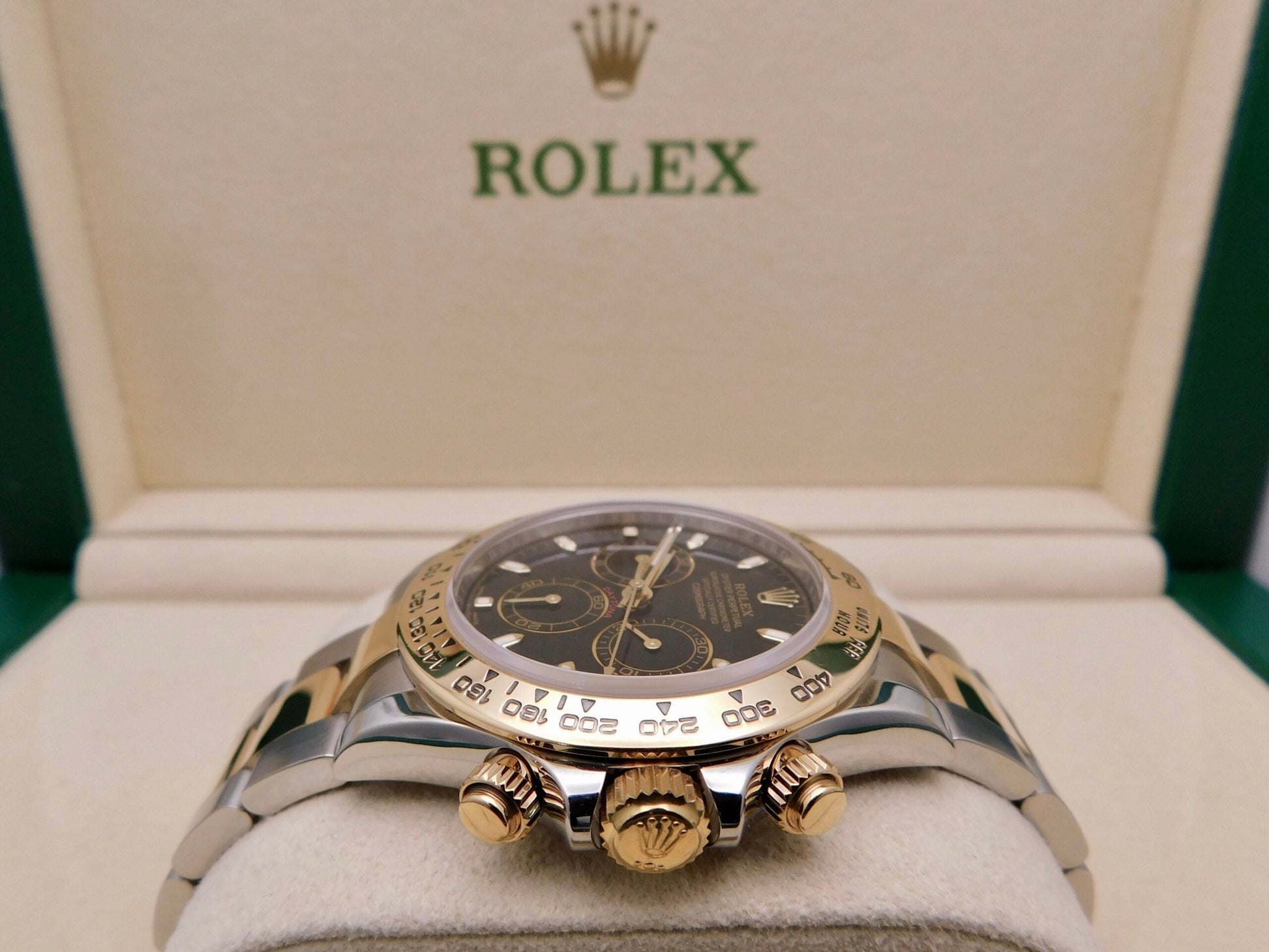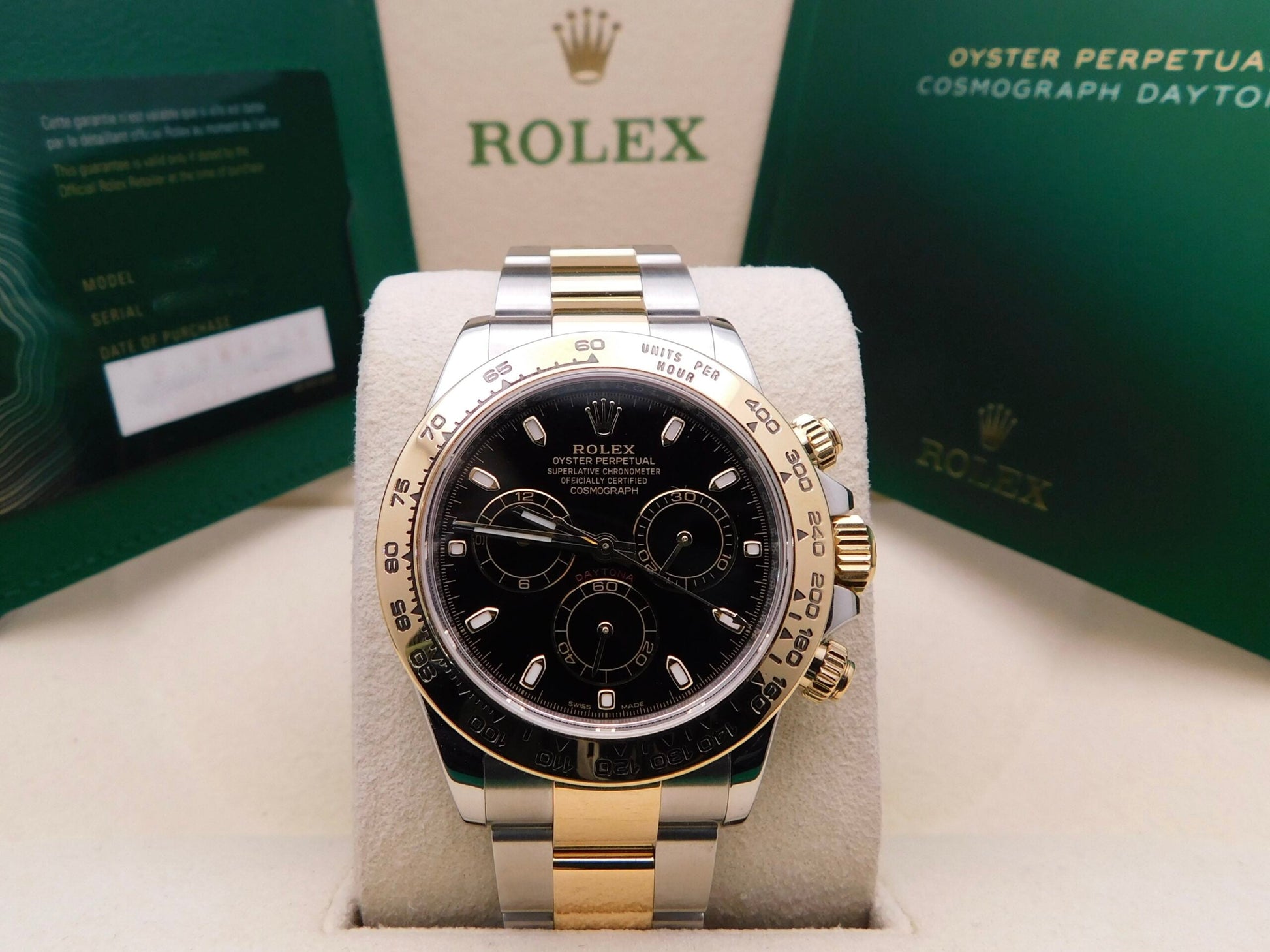 - Model: DaytonaReference Number: 116503Gender: Men’sMetal: Stainless Steel & Yellow GoldCase Size: 40.00mmWrist Size: Please contact us prior to purchasing this item if the removal of links is necessary.Movement: Original Rolex Swiss Automatic Movement.Crystal: Original Rolex Scratch-Resistant Sapphire.Dial: Original Rolex Black Dial.Bezel: Original Rolex Yellow Gold Bezel.Band: Original Rolex Stainless Steel & Yellow Gold Oyster Band.Box: YESPapers: YES