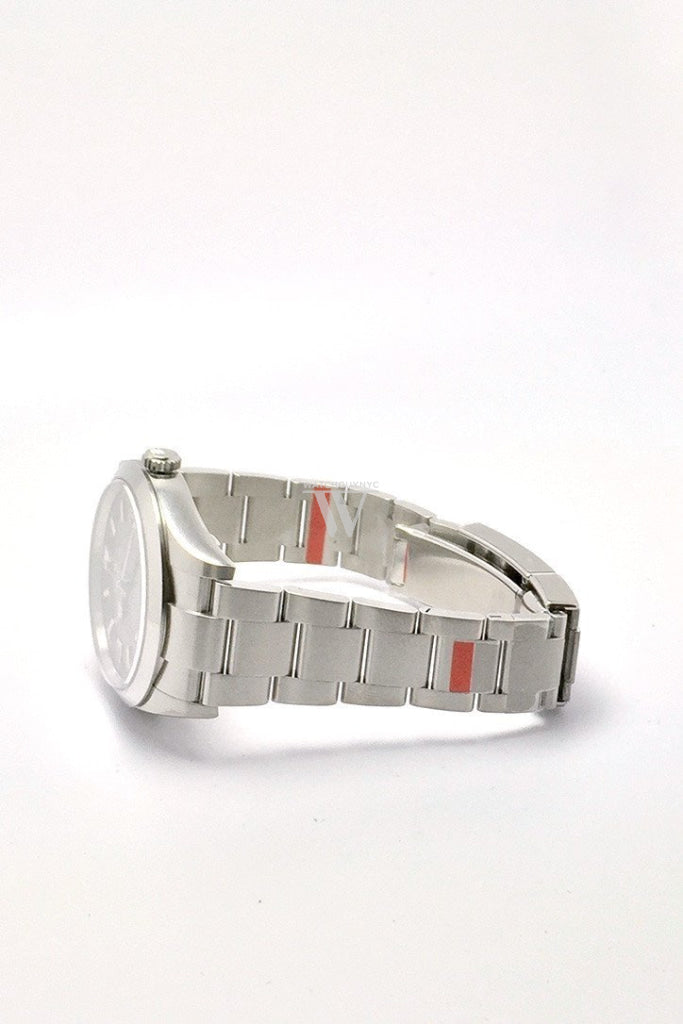 Stainless steel case with a oyster bracelet. Fixed domed stainless steel bezel. Black dial with luminous hands and stick hour markers. Arabic numerals mark the 3, 6 and 9 o'clock positions. minute markers around the outer rim. Dial Type: Analog. Luminescent hands and markers. Self winding automatic movement. Scratch resistant sapphire crystal. Solid case back. Case diameter: 39 mm. Round case shape. Deployment clasp. Water resistant at 100 meters / 330 feet. Functions: hours, minutes, seconds. Luxury watch style. Watch label: Swiss Made. Rolex Explorer Black Dial Domed Bezel Oyster Bracelet Mens Watch. 214270