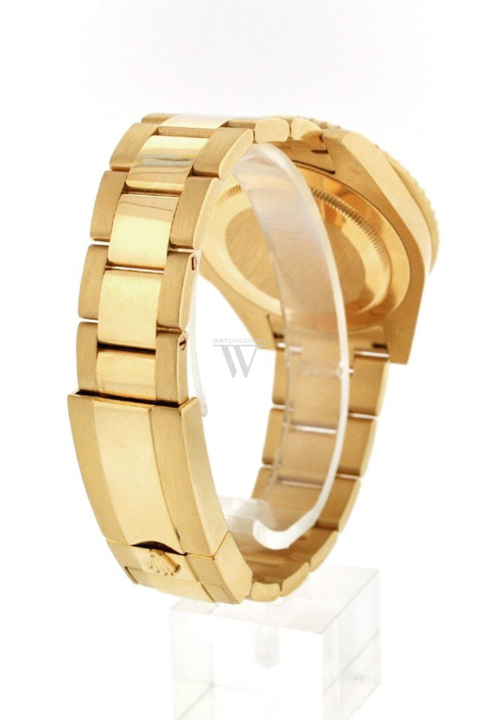 18k yellow gold case with a 18k yellow gold rolex oyster bracelet. Bi-directional rotating - 18k yellow gold bezel. Green dial with yellow gold-tone hands and luminous dots hour markers. Dial Type: Analog. Luminescent hand and dial markers. Date display at the 3 o'clock position. Automatic movement. Scratch resistant sapphire crystal. Case diameter: 40mm. Case thickness: 12mm. Round case shape. Deployment clasp. Water resistant at 100 meters / 330 feet. Functions: date, hour, minute, second. Luxury watch style. Watch label: Swiss Made. Item Variations: 116718, 116718-GSO, Rolex-116718, Rolex-116718-GSO. Rolex GMT Master II Green Dial 18K Yellow Gold Rolex Oyster Automatic Mens Watch 116718