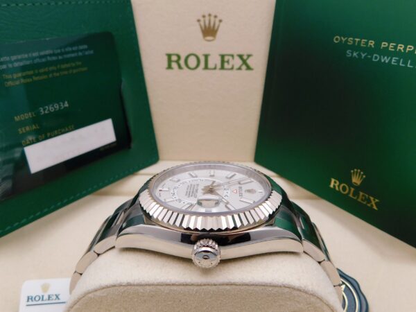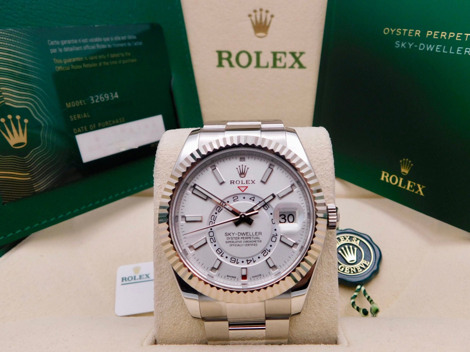 - Brand: RolexModel: Sky-DwellerReference Number: 326934Gender: Men’sMetal: Stainless SteelCase Size: 42.00mmWrist Size: Please contact us prior to purchasing this item if the removal of links is necessary.Movement: Original Rolex Swiss Automatic Movement.Crystal: Original Rolex Scratch-Resistant Sapphire.Dial: Original Rolex White Index Dial with the date at 3 o’clock.Bezel: Original Rolex 18K White Gold Fluted Bezel.Band: Original Rolex Stainless Steel Oyster Band.Box: YESPapers: YES