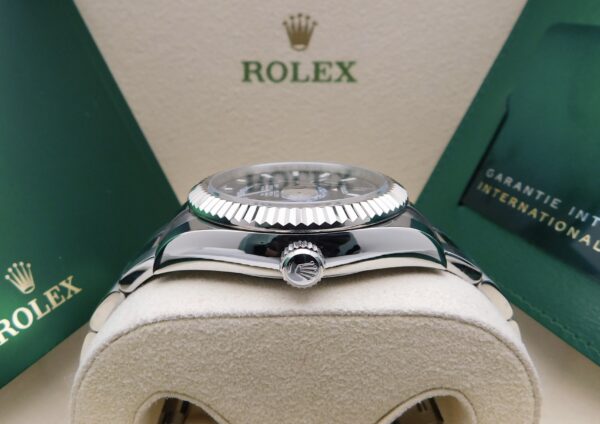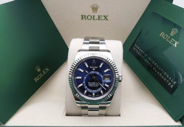 - Brand: RolexModel: Sky-DwellerReference Number: 326934Gender: Men’sMetal: Stainless SteelCase Size: 42.00mmWrist Size: Please contact us prior to purchasing this item if the removal of links is necessary.Movement: Original Rolex Swiss Automatic Movement.Crystal: Original Rolex Scratch-Resistant Sapphire.Dial: Original Rolex Blue Index Dial with the date at 3 o’clock.Bezel: Original Rolex 18K White Gold Fluted Bezel.Band: Original Rolex Stainless Steel Oyster Band.Box: YESPapers: YES