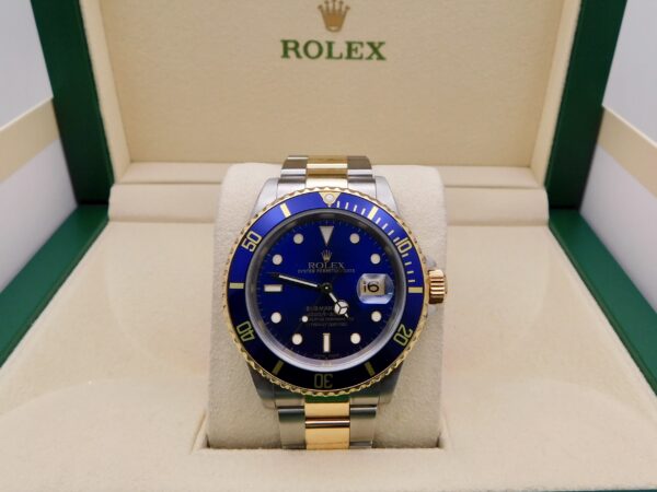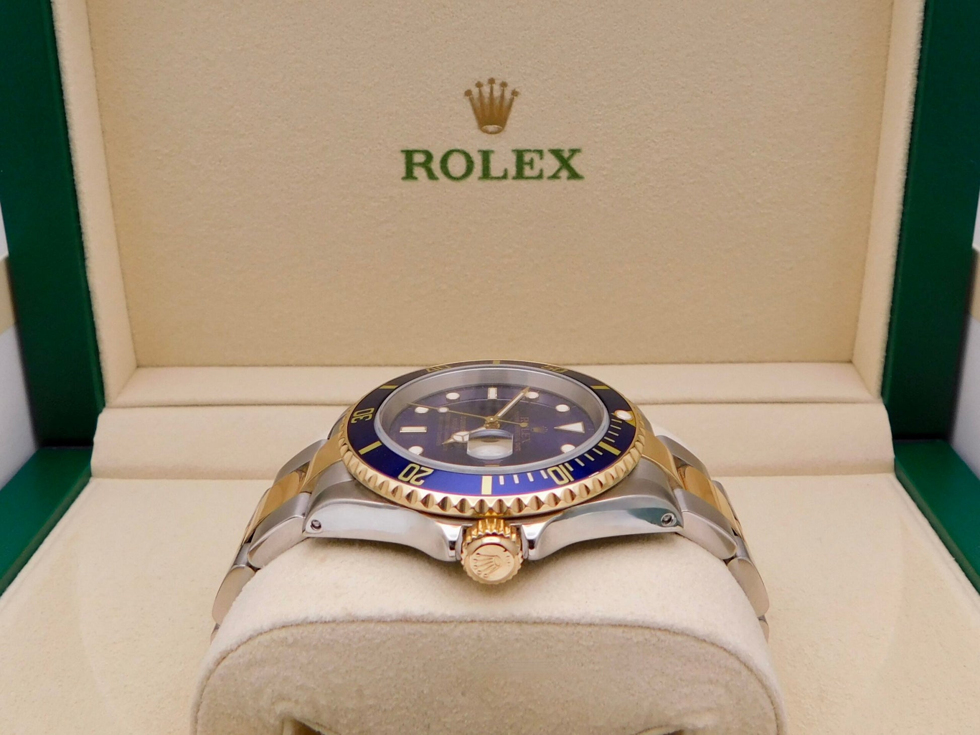 - Model: SubmarinerReference Number: 16613Gender: Men’sMetal: Stainless Steel & Yellow GoldCase Size: 40.00mmWrist Size: Please contact us prior to purchasing this item if the removal of links is necessary.Movement: Original Rolex Swiss Automatic Movement.Crystal: Original Rolex Scratch-Resistant Sapphire.Dial: Original Rolex Blue Dial.Bezel: Original Rolex Blue & Yellow Gold Bezel.Band: Original Rolex Stainless Steel & Yellow Gold Oyster Band.Box: YESPapers: NO