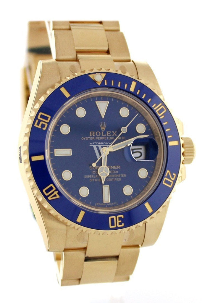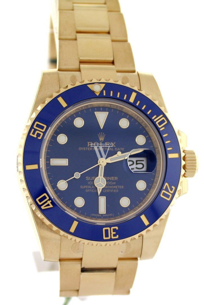 18kt yellow gold case with a 18kt yellow gold oyster bracelet. Unidirectional rotating 18kt yellow gold bezel with blue cerachrom top ring. Blue dial with luminous hands and dot hour markers. Minute markers around the outer rim. Dial Type: Analog. Luminescent hands and dial markers. Date displays at the 3 o'clock position. Automatic movement. Scratch resistant sapphire crystal. Solid case back. Case diameter: 40 mm. Case thickness: 14 mm. Round case shape. Water resistant at 300 meters / 1000 feet. Functions: hours/ minutes/ seconds/ date. Luxury watch style. Watch label: Swiss Made. Rolex Submariner Blue Dial 18kt Yellow Gold Oyster Bracelet Mens Watch 116618